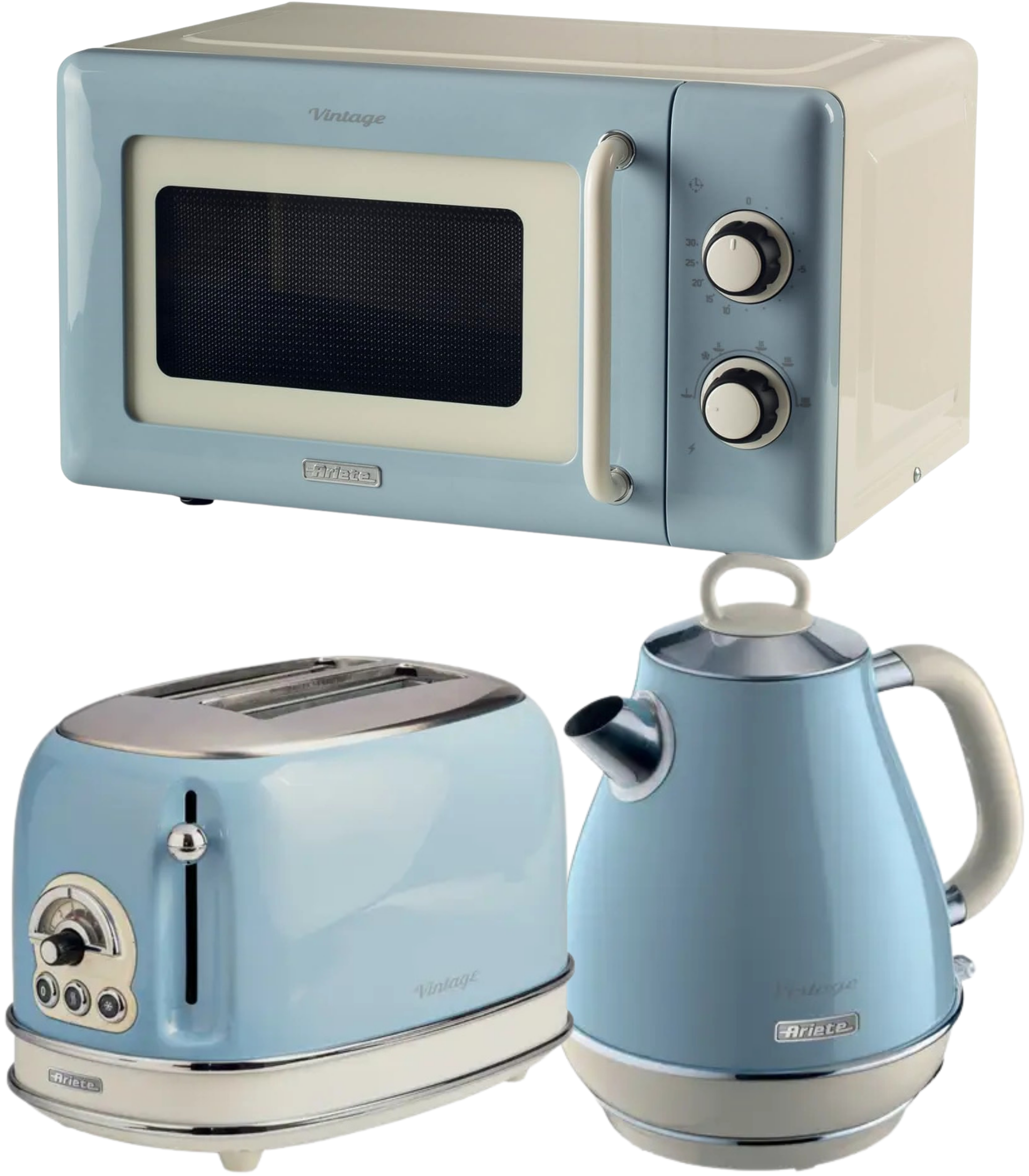 Ariete Vintage Blue Retro 1.7L Jug Kettle, 2 Slice Toaster & 800W 20L Microwave Kitchen Set AR6905/AR5515/AR3961. Fast Dispatch & Free Next Working Day Delivery. 2 Year ARIETE Manufacturer Guarantee