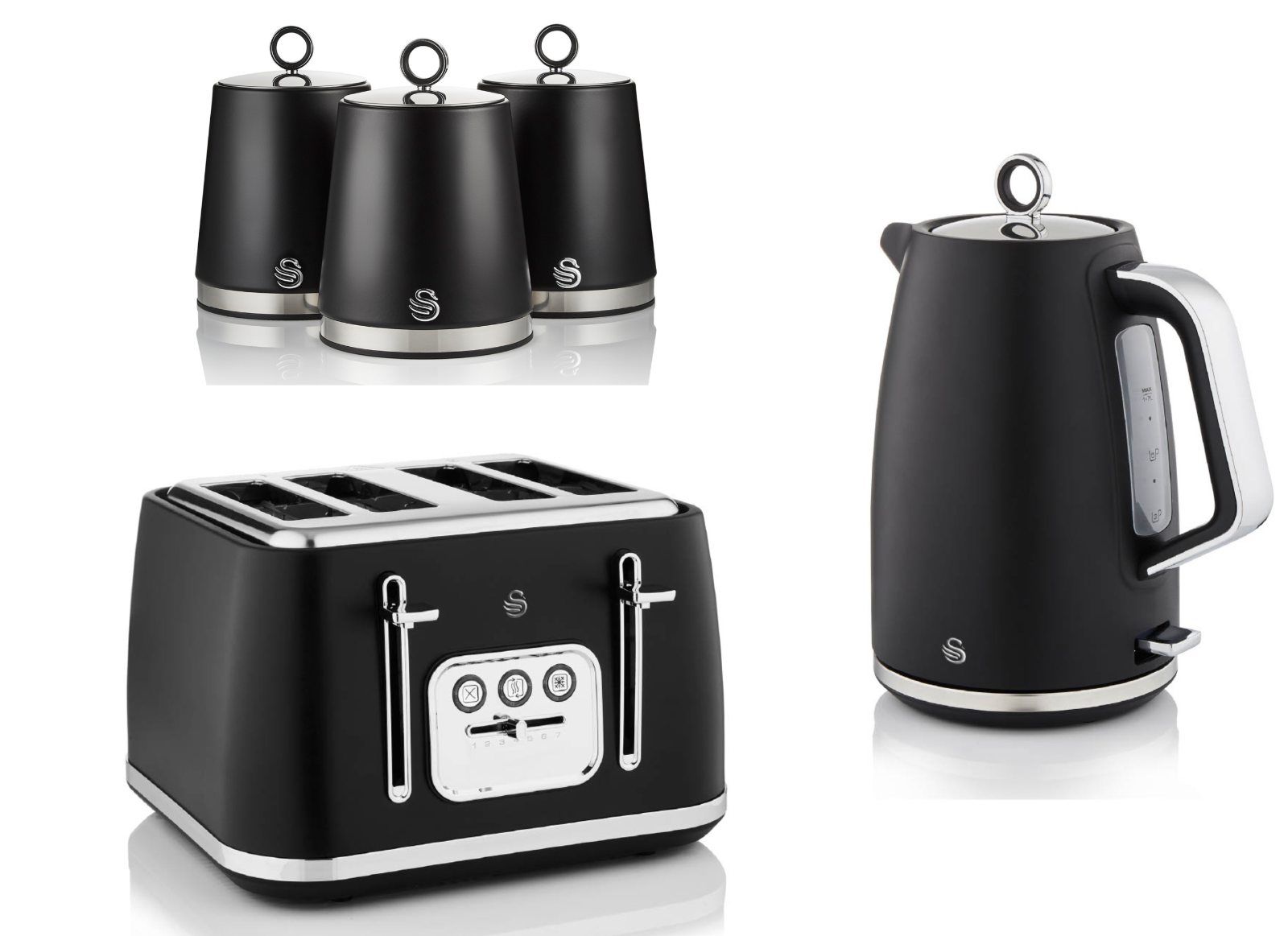 Swan Serenity Black 1.7L 3KW Kettle, 4 Slice Toaster & Tea, Coffee, Sugar Canisters. Beautiful Design Matching Swan Kitchen Set of 5