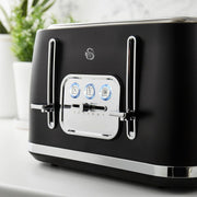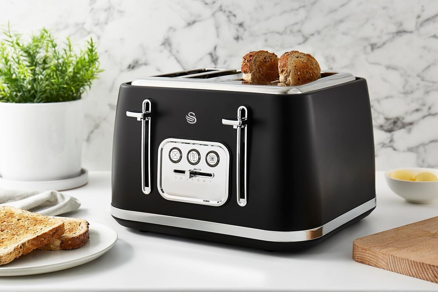 Make perfect toast every time with the Swan Serenity ST19024BLK 4-slice toaster. If you live in a busy household, toast four slices of bread, muffins, crumpets, bagels and more at one time, removing the stress of getting everyone out the door. Some baked goods need the right time toasting to get the best possible results, this black toaster features six adjustable browning levels, so your food is the perfect consistency. Has your toast gone cold? Reheat brings food back to its optimal temperature at the touch of a button without burning, so it's ready to eat again. Freezing bread is a great way to help save money and avoid food waste, but what if you want a quick snack? Press the defrost button after the toast is pushed down and your bread will be ready to eat from frozen in minutes. To keep your kitchen worktop nice and tidy, the removable crumb tray lets you easily dispose of crumbs and integrated storage. Our new Serenity collection encompasses our signature Swan design with contemporary matt finish.