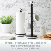 This Swan Serenity SWKA18537BLK black towel pole and mug tree set is the perfect addition to your kitchen countertop. Forming part of the Swan Serenity breakfast and storage collection, this set features stylish stainless steel accents to compliment any kitchen decor. The mug tree can hold up to 6 cups and mugs of all kinds, while the towel pole fits all standard sized kitchen rolls, making all your essentials easily accessible from your countertop. The bases are weighted and non-slip to provide additional stability and protect your worktop from scratches. Swan has been providing high-quality household appliances and kitchenware to millions of homes across the UK for over 100 years.