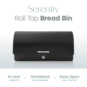 The Swan Serenity SWKA18535BLK black bread bin is the ultimate storage solution to keep your baked goods fresh and easy to access on your kitchen worktop. The lid features a roll top design with large bar handle, making the bread bin easy to open. Its large 14 litre capacity means you can fit a variety of loaves, muffins, bagels, or crumpets at one time, which is perfect for those busy family homes. This large bread bin features ventilation holes at the back, which regulates moisture and facilitates airflow to prevent stale odours, keeping your baked goods fresh for longer. The robust stylish matt smooth body is highly durable for everyday use, while the non-slip feet provide stability on your worktop. It's also easy to maintain, requiring a simple wipe with a damp cloth to clean. The Swan Serenity collection combines our signature Swan design with contemporary matt finish.