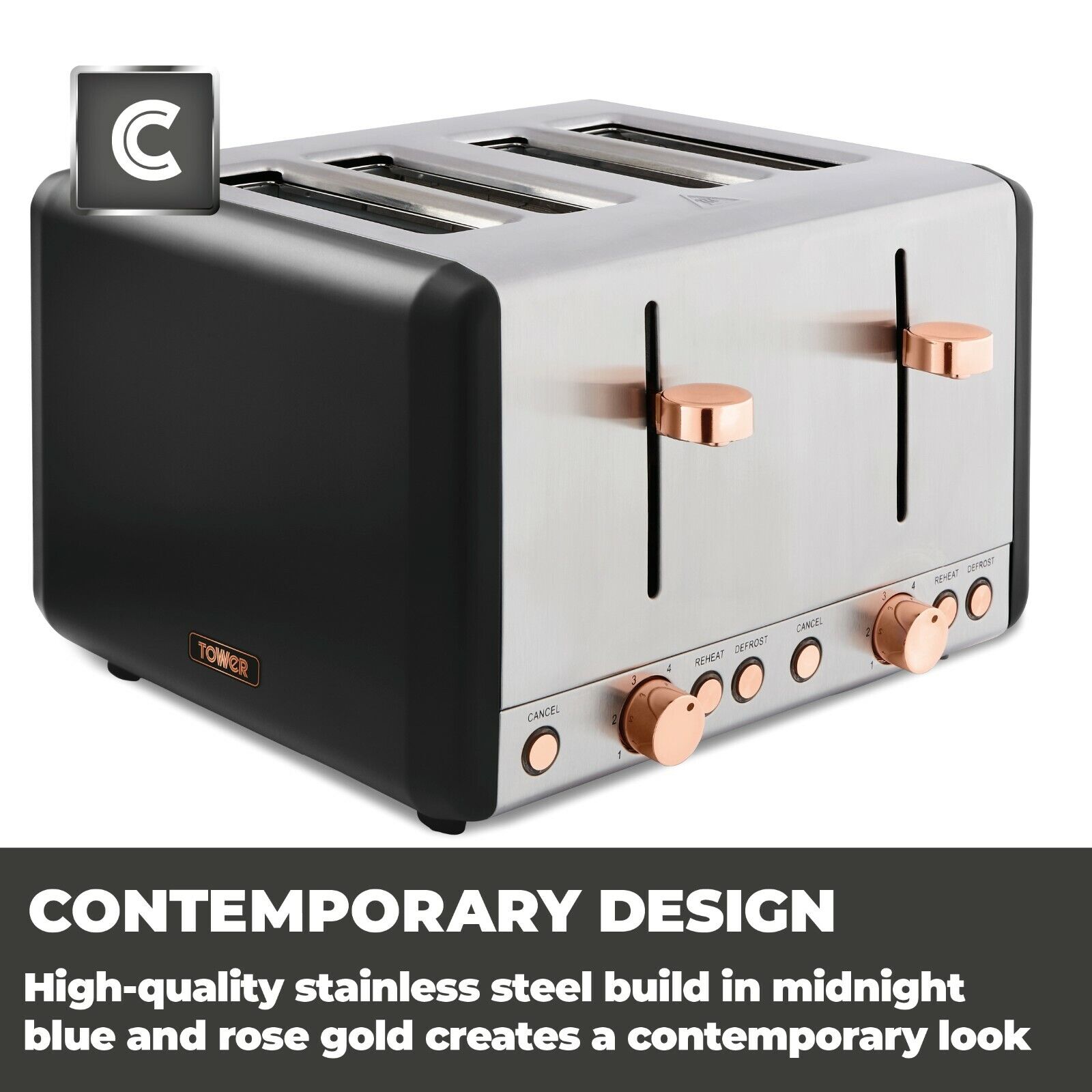Combining black and rose gold with a durable stainless steel finish, this Cavaletto 4 slice toaster injects a splash of contemporary design into your breakfast routine. The variable browning controls let you select the perfect toasting texture to suit your taste. Defrost, reheat and cancel options put you in control of the toasting cycle, so you can warm up your snacks or toast straight from frozen. The removable crumb tray captures any excess crumbs to make for easy disposal and to maintain the toaster's quality performance. The integrated cord storage keeps your counter surfaces free from trailing wires.