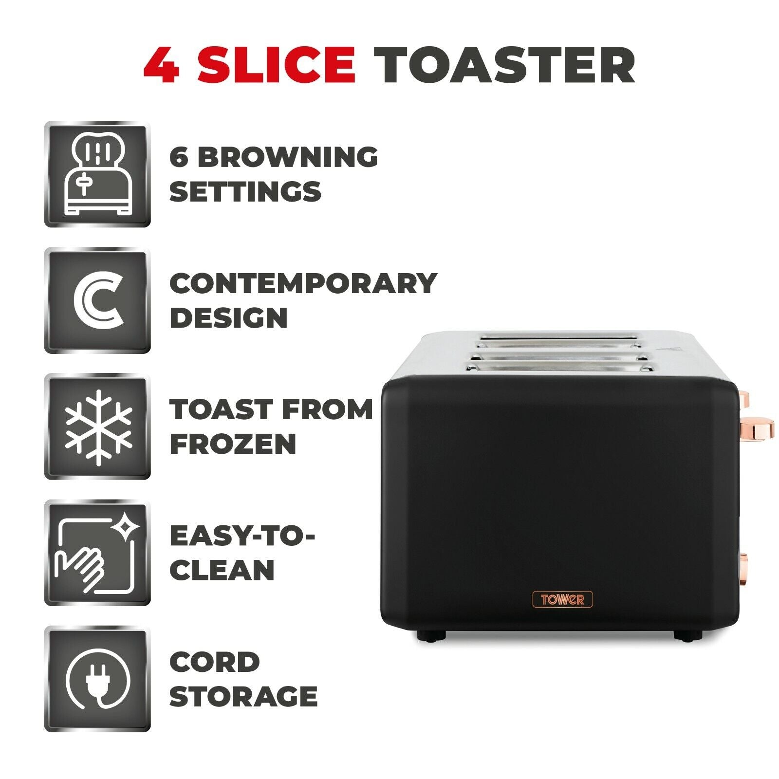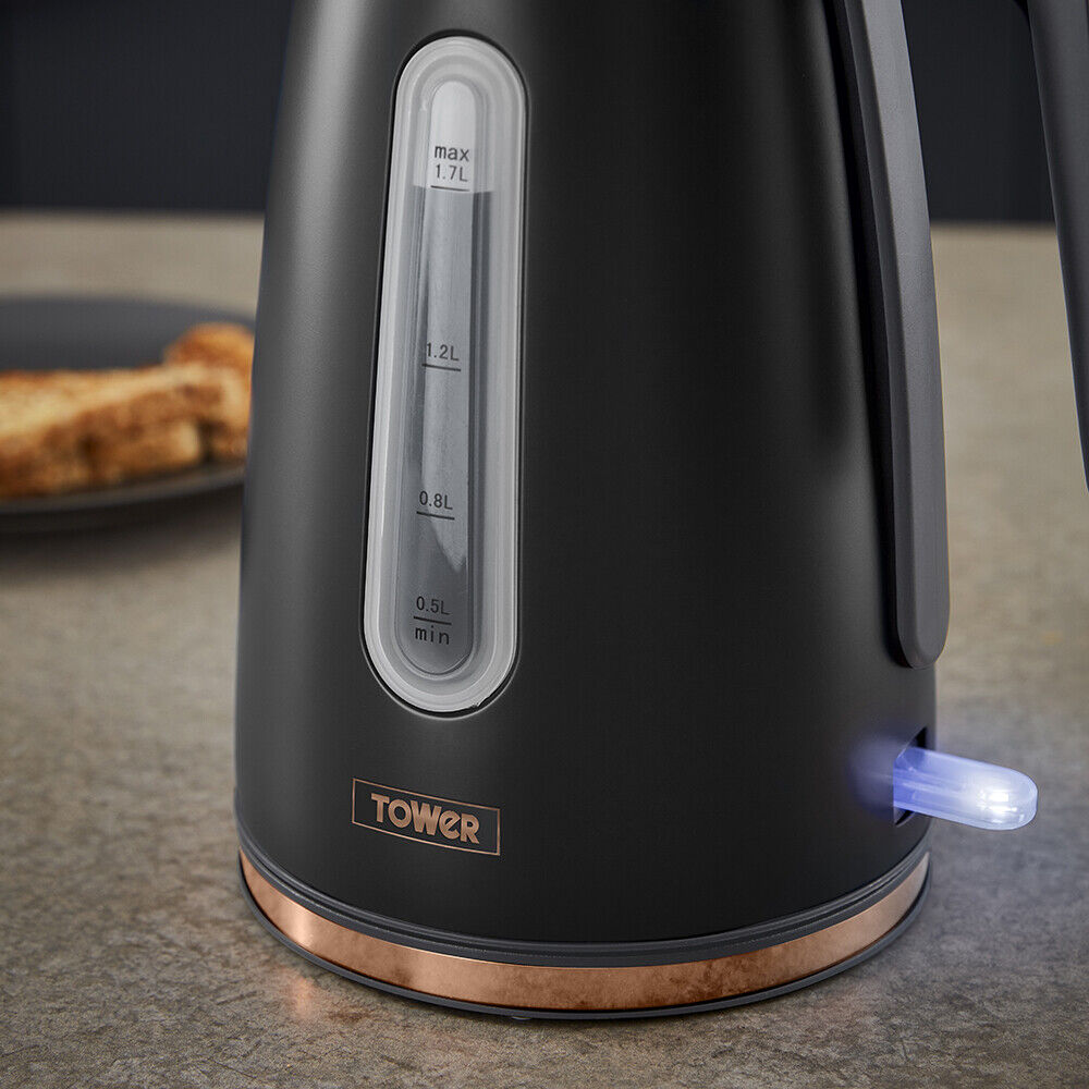 Brand New Tower Cavaletto Jug Kettle & 4 Slice Toaster Set in Black & Rose Gold. Fast Dispatch & Free Next Working Day Delivery from UK Stock. Full 3 Year Manufacturer Guarantee