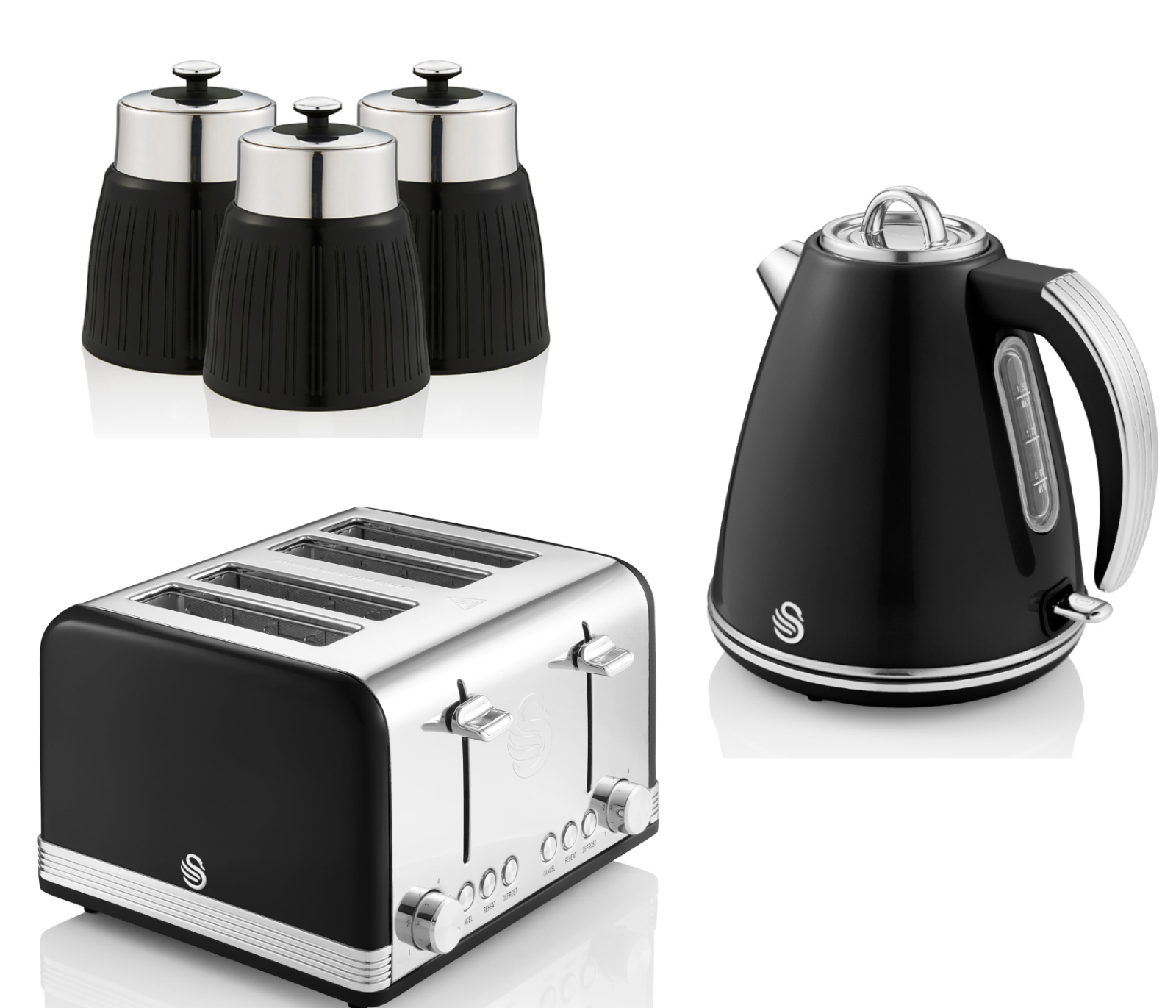 Brand New Swan Retro 1.5L 3KW Retro Jug Kettle, 4 Slice Toaster & Tea Coffee & Sugar Canisters Matching Kitchen Set in Black