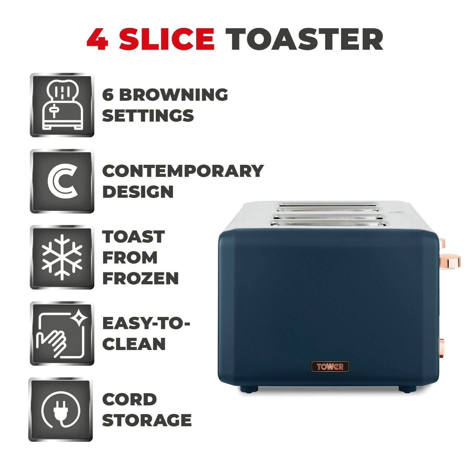 Brand New Tower Cavaletto Jug Kettle & 4 Slice Toaster Set in Midnight Blue & Rose Gold. Fast Dispatch & Free Next Working Day Delivery from UK Stock. Full 3 Year Manufacturer Guarantee