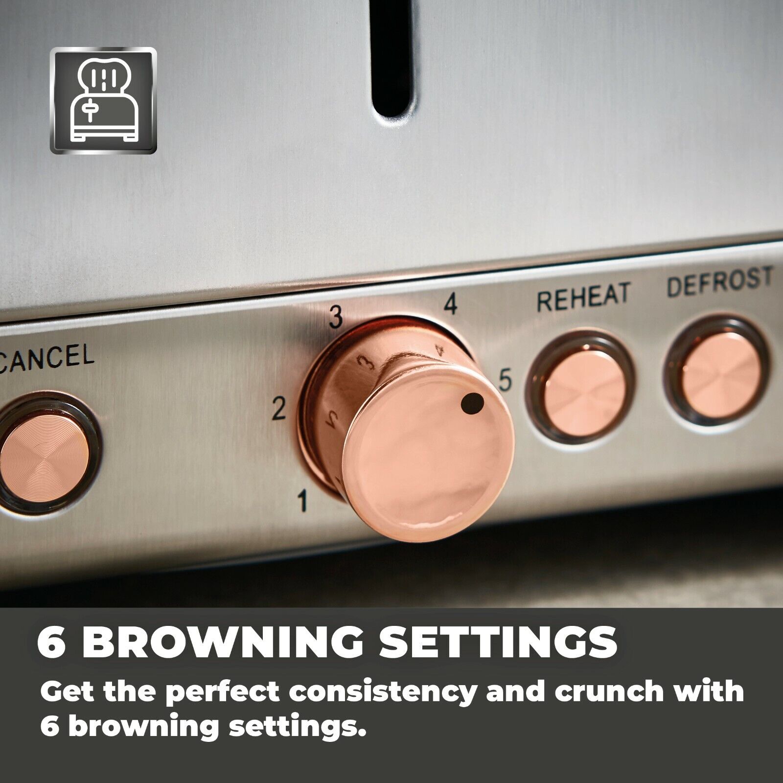 Combining midnight blue and rose gold with a durable stainless steel finish, this Cavaletto 4 slice toaster injects a splash of contemporary design into your breakfast routine. The variable browning controls let you select the perfect toasting texture to suit your taste. Defrost, reheat and cancel options put you in control of the toasting cycle, so you can warm up your snacks or toast straight from frozen. The removable crumb tray captures any excess crumbs to make for easy disposal and to maintain the toaster's quality performance. The integrated cord storage keeps your counter surfaces free from trailing wires.