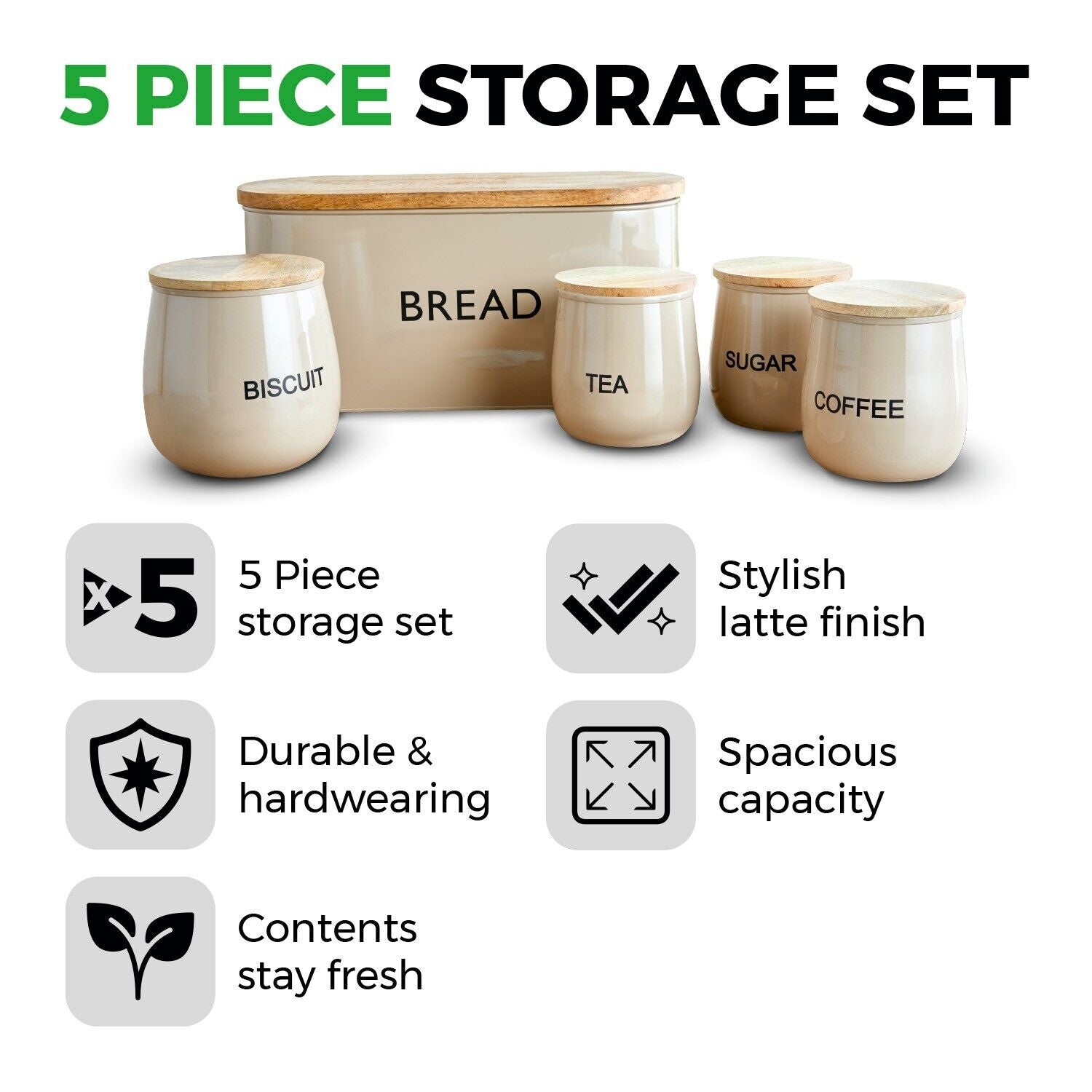 Tower 5 Piece Storage Set Bread Bin Canisters & Biscuit Tin in Latte T826212MSH
