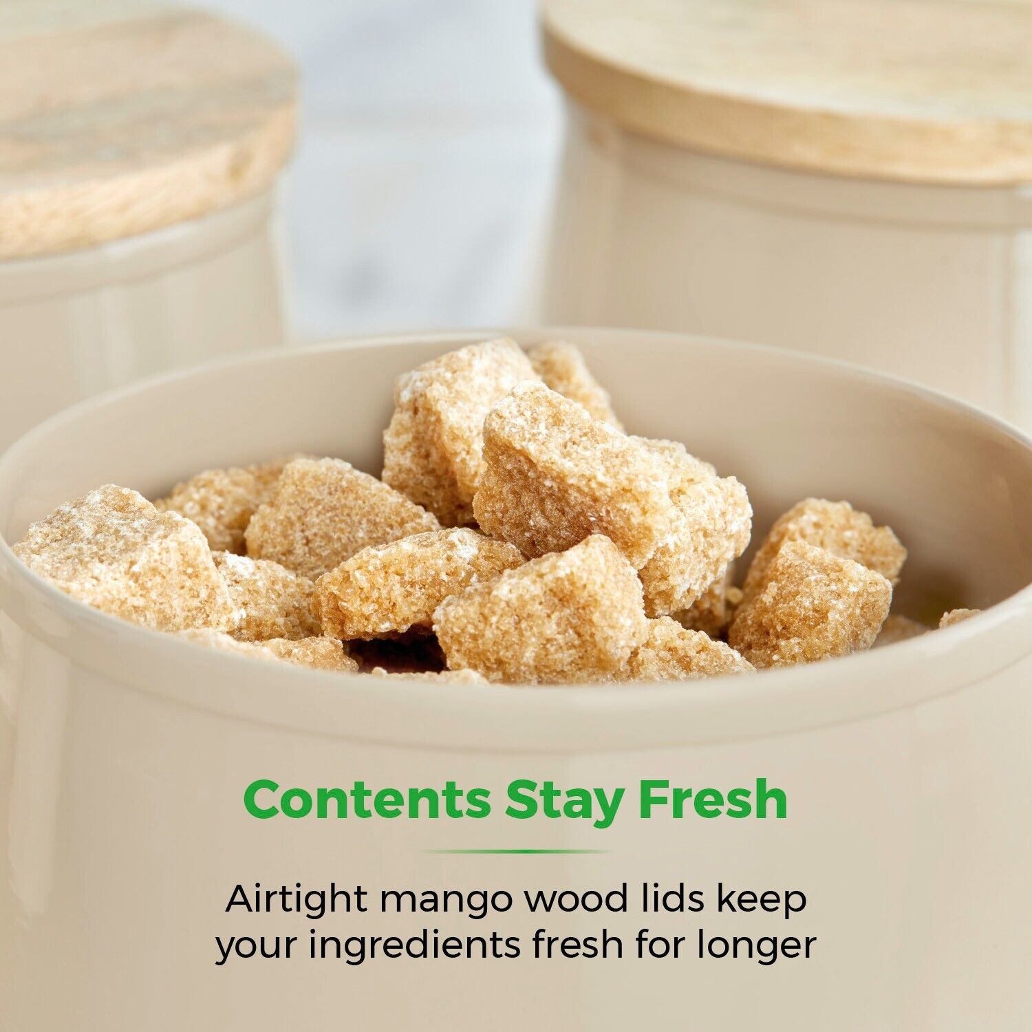 Accessorise your kitchen with the durable and decorative builds of the Tower 5-piece storage collection. Complete with a steel bodied bread bin, biscuit barrel and 3 piece canister set, you can keep all of your baked items and loose ingredients stored away with longer-lasting freshness. Each piece has a smooth Latte finish to complement any kitchen decor, so it catches the eye but isn't overpowering. The mango wood lids are airtight so you can store your choice of dried fruit, pastas, tea, coffee and sugar for long-lasting freshness. The flip top lid on the bread bin allows moisture to escape, keeping baked goods fresh for longer. The steel body only required a simple wipe clean to maintain the pristine finish