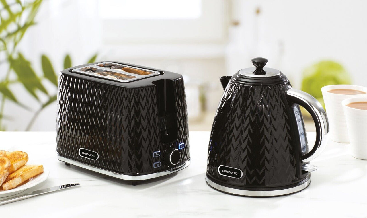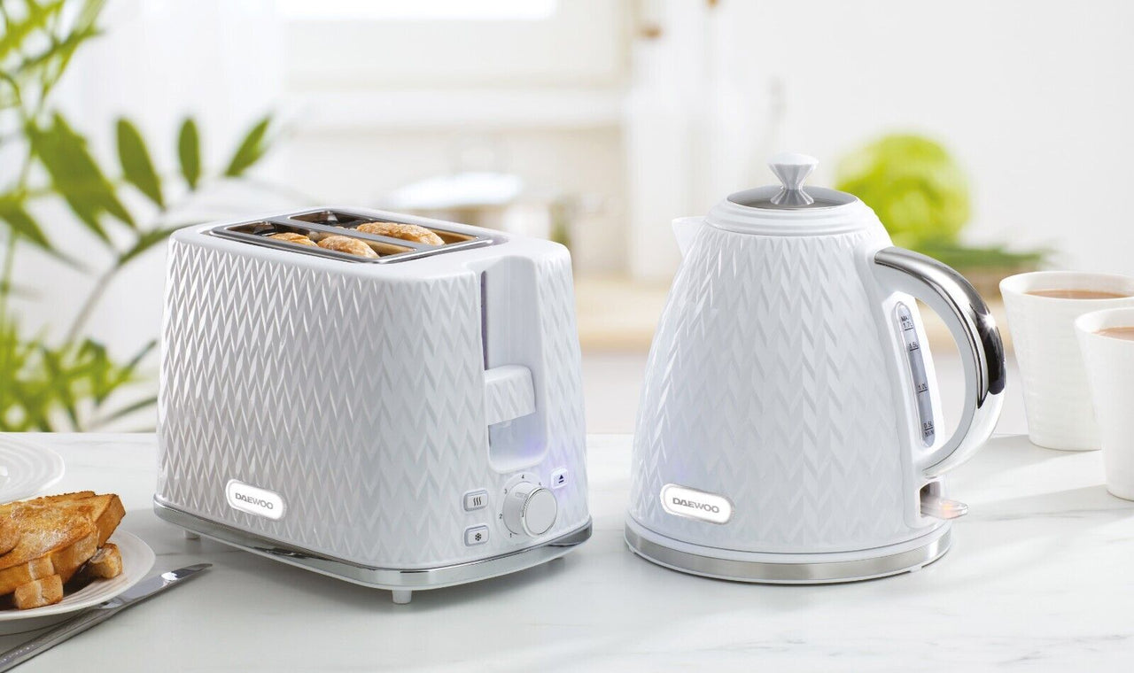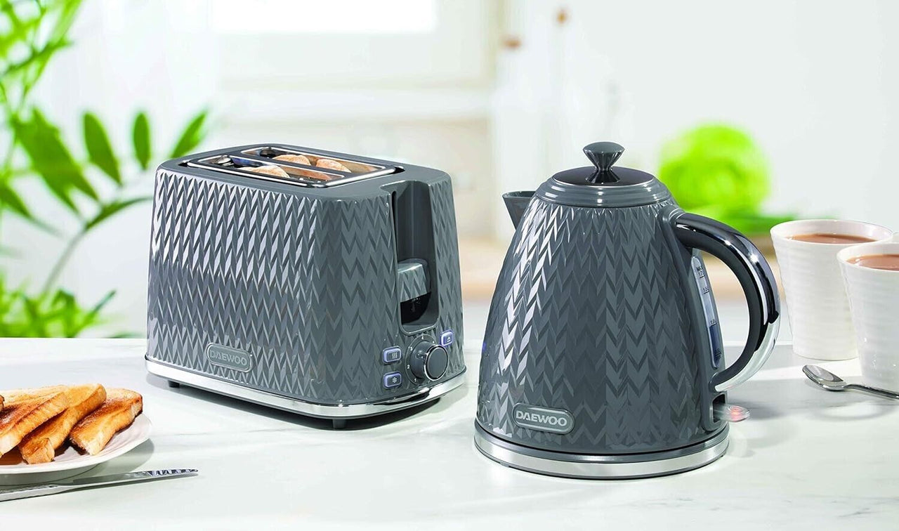 Transform your kitchen into a hub of style and functionality with the Daewoo Argyle Collection of Kettles & Toasters. Whether you're brewing your morning coffee or toasting your favorite artisan bread, do it with flair and finesse with this range of kettles and toasters. Featuring a Textured Design, Gloss Finish and Chrome Accents, these eye-catching Kettles & Toasters are available in Black, Dark Grey and White