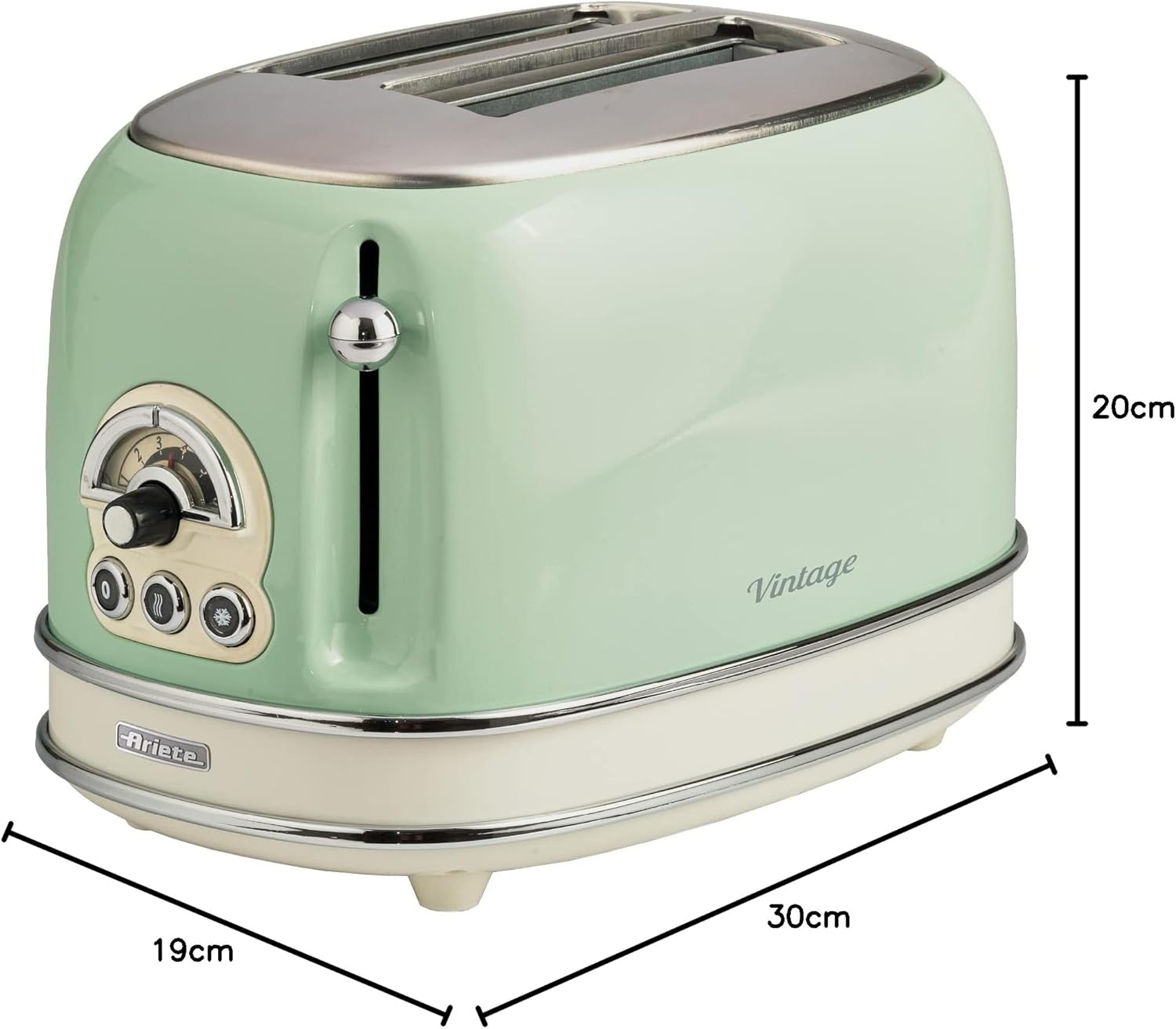 The Ariete 155 Vintage Electric Toaster is the design toaster which, with its unique shapes and pastel colours, decorates your kitchen. The compact size of this taster (30 L x 19 W x 20 H) makes it a perfect decor element for the kitchen. The Vintage electric toaster features 2 slots for browning the slices of bread at 6 different toasting levels. When the toast is ready, the automatic eject function allows you to take the slice of bread safely. The removable crumb tray ensures easy cleaning and the lower cord compartment allows you to save space. The Vintage Toaster features a sturdy design: the stainless steel outer walls in pastel colours make it a unique and unmistakable object in the panorama of small kitchen appliances. Ariete makes iconic and functional products: the Vintage Line combines Italian design with the ease of use that is the hallmark of Ariete, Italian company that is a leader in toasters for domestic use.