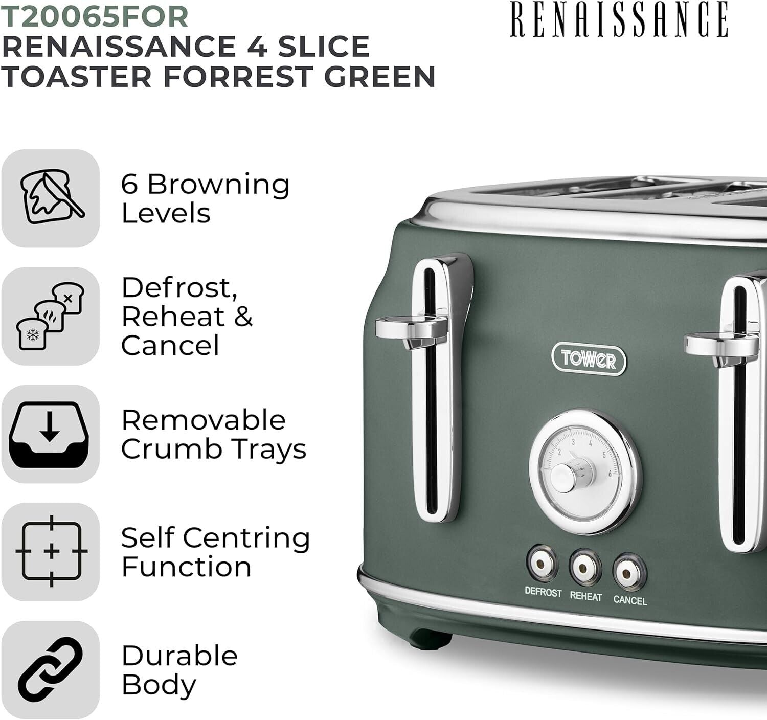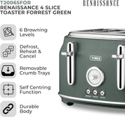 Tower Renaissance 4 Slice Toaster, 1630W, Forest Green