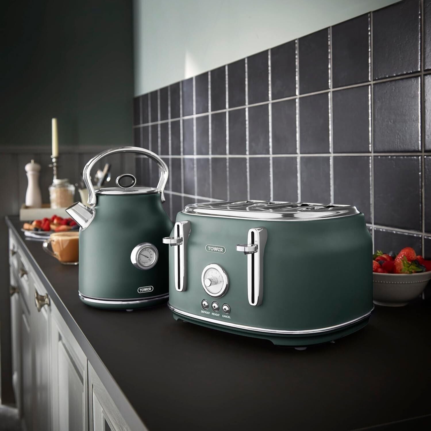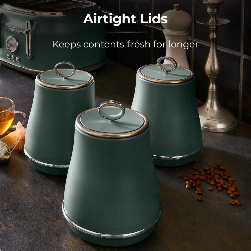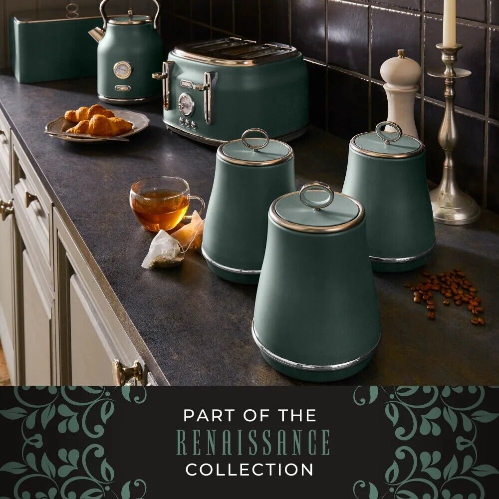 Brand New Tower Renaissance Forest Green 1.7L 3KW Kettle, 4 Slice 1630W Toaster, Bread Bin & Tea, Coffee & Sugar Canisters Set. Beautiful Matching Stylish Design Kitchen Set of 6 in Forest Green