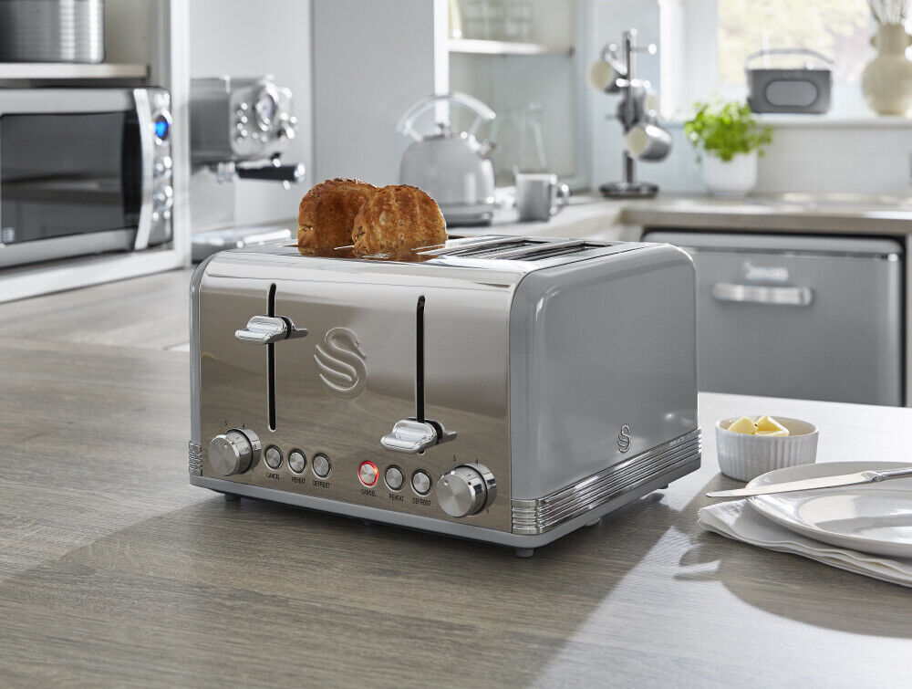 Count on the Swan Retro 4-Slice Toaster for perfectly browned bread every morning. Along with 1600 watts of power, this stylish kitchen appliance has defrost and reheat functions, plus a warming rack, giving you many options on how to prepare your favourite breads. A high-lift eject button ensures your fingers stay safe while automatic shut-off and red indicator lights help keep your toast from burning.