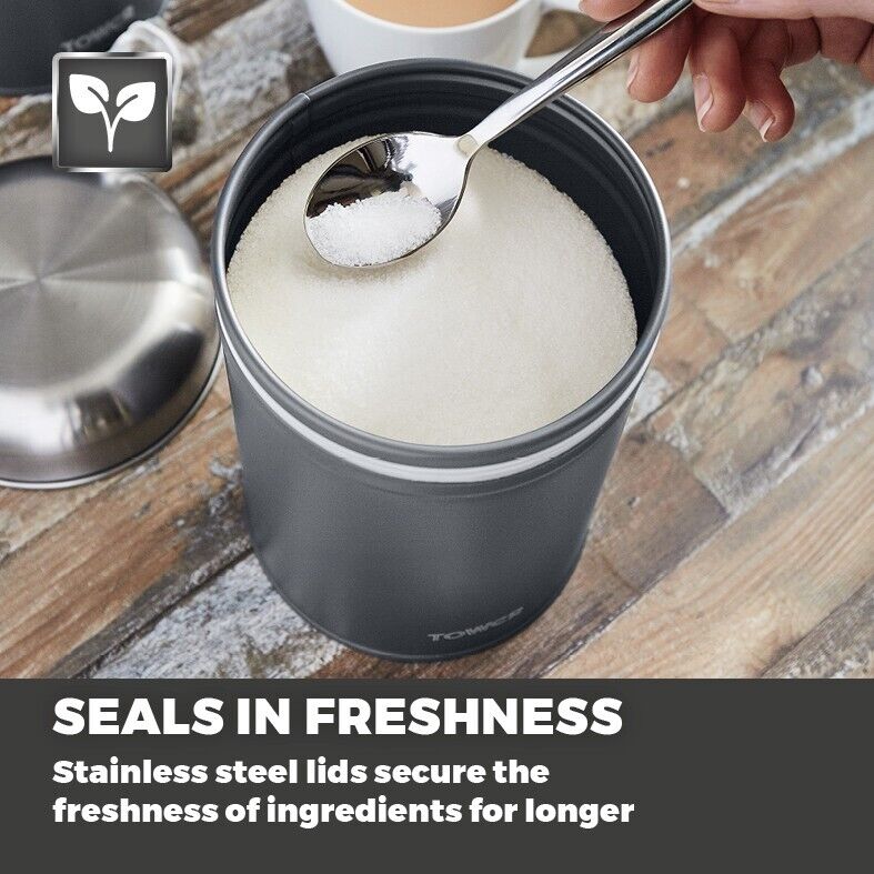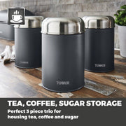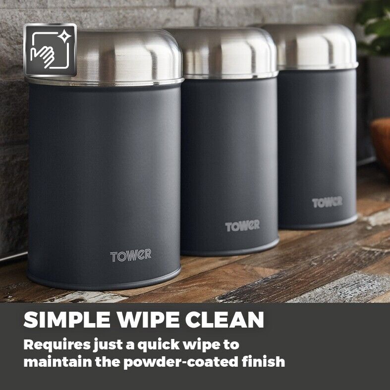 Add an iconic trio to your kitchen with the Tower infinity stone canisters to help secure the fresh flavours of your chosen loose ingredients. The durable slate colour powder coated bodies store an ample quantity of your chosen tea, coffee, sugar, herbs or spices on your kitchen counter for easy retrieval. The mirrored pull top stainless steel lids offer a secure airtight seal that locks in the freshness of each canister whilst presenting maximum access to the contents inside. To maintain the appearance of each infinity stone canister, simply wipe down to clean.