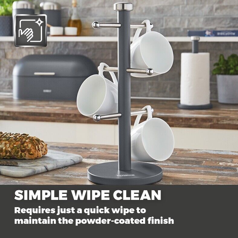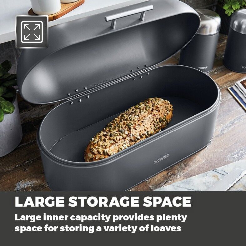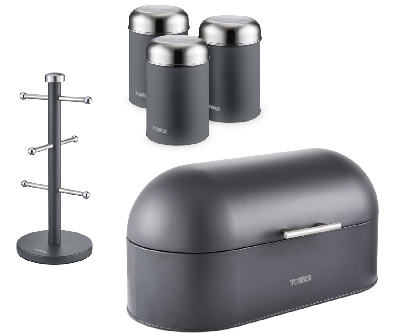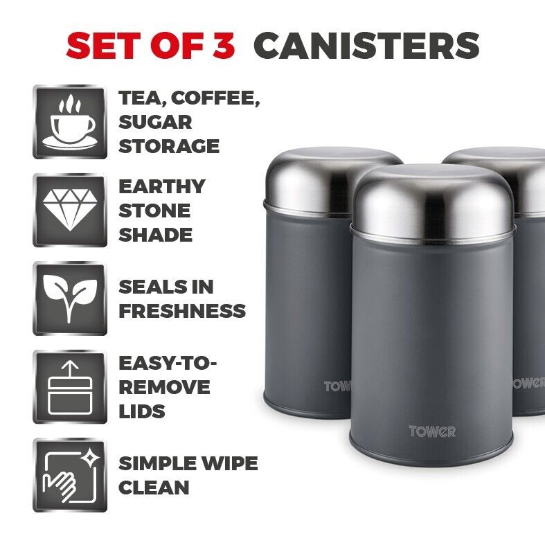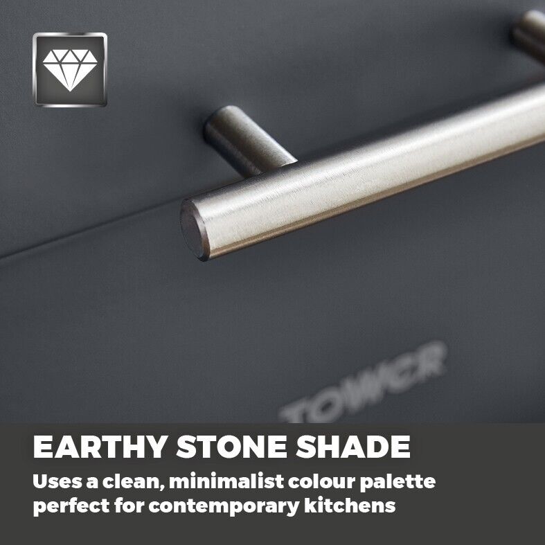 New Tower Infinity Stone Dome Bread Bin, Set of 3 Tea, Coffee & Sugar Canisters & Mug Tree Matching Set in Slate Grey. Modern Kitchen Storage Set. Brand New UK Stock. Free Delivery. Full 3 Year Tower Manufacturer Guarantee Infinity Stone Dome Bread Bin