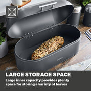 This stylish Infinity Stone bread bin has been designed to ensure that your baked goods are kept in the best condition possible. Featuring built-in ventilation, moisture is trapped to prevent goods from being dried out, so your loaf, muffins, crumpets and bagels will remain fresh for longer and you can enjoy the same great taste. Its large capacity provides ample space to fit baked goods of varying sizes, while the durable iron body makes it very easy to maintain, requiring just a simple wipe to clean. Make this bread bin a part of your essential Tower kitchen collection.