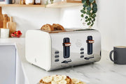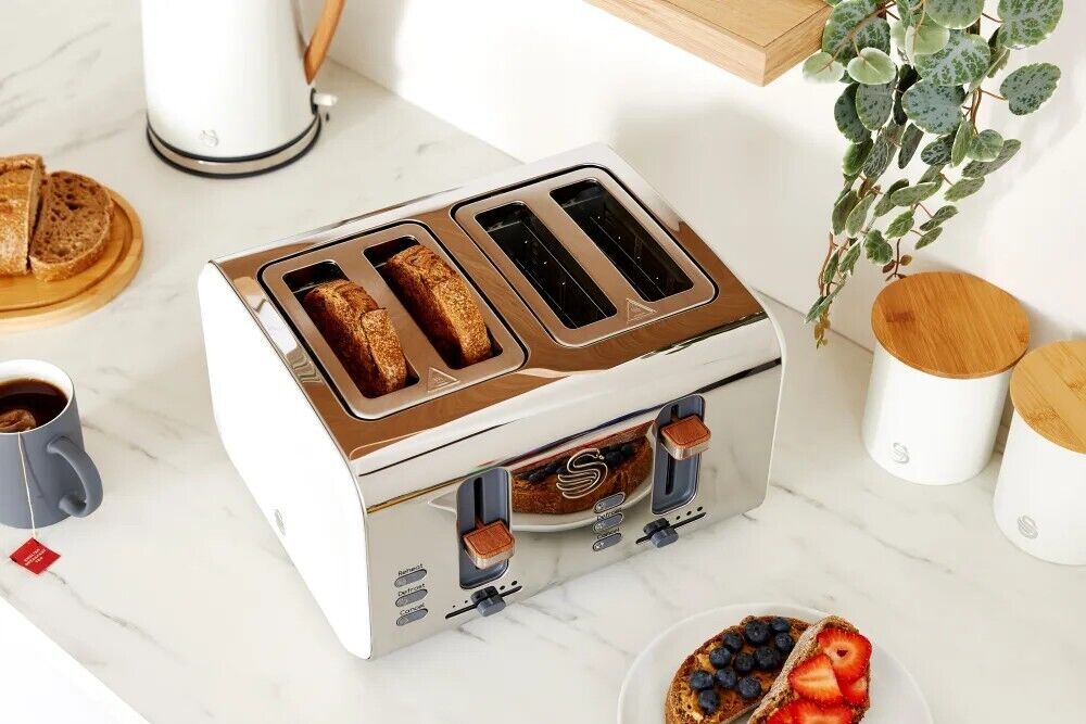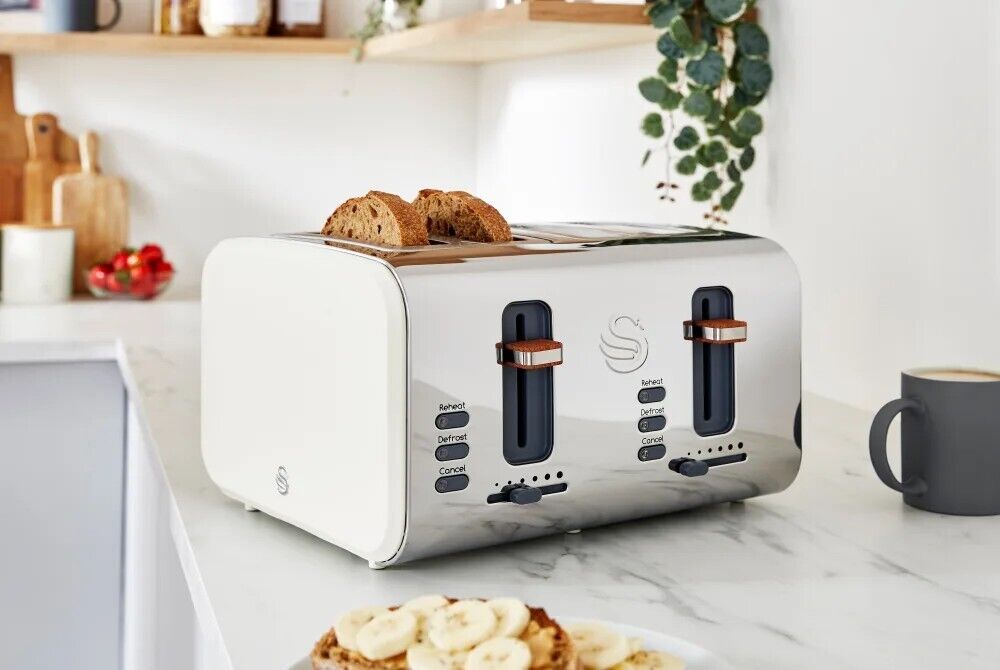 Start your morning off right with a delicious breakfast using the Swan Nordic ST14620WHTN white 4-slice toaster. Whether it's toast, muffins, crumpets or bagels, get perfect results customised to your liking thanks to six adjustable browning levels. You can also toast four rounds at one time, perfect for a busy household. Toast gone cold? Just press the reheat button and your food will heat up without burning, ready to eat again. Freezing bread is a great money saver and food waste solution, but what if you fancy a quick snack? Just press defrost after the toast is pushed down and your bread will be ready to eat from frozen within minutes. To keep your kitchen worktop nice and tidy, this grey toaster features removable crumb trays to easily dispose of crumbs and integrated cord storage. Includes non-slip rubber feet for added stability. The Swan Nordic collection is inspired by Scandinavian minimalist design, featuring neutral colour schemes and wood-effect accents to compliment any home decor.