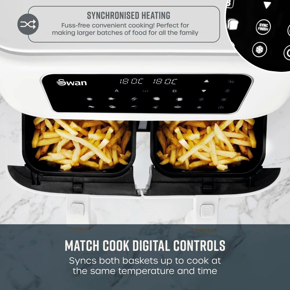 This Swan SD10410WHT Nordic White dual basket digital air fryer is an energy saving alternative to oven cooking. Swan Cyclone Technology creates crispy fried meals with minimal oil needed for healthier results. Features 13 pre-set functions for Fries, Bake, Dehydrate and more. Smart Finish cooks two foods at once on different times and temperatures, while Match Cook syncs both baskets to cook on the same settings. Swan Nordic is inspired by Scandinavian minimalist design.