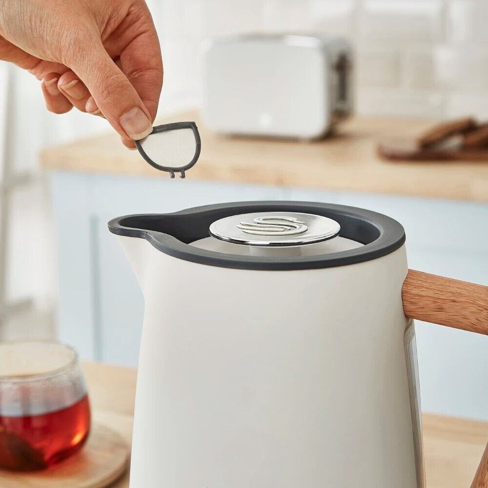 Wake up or wind down with a nice brew using the Swan SK14610WHTN Nordic white cordless electric kettle. Featuring a large 1.7 litre capacity, make up to 8 cups on a single boil, perfect for entertaining friends and family. Need a quick drink before heading out the door? The 3KW fast boil technology boils one cup in under 45 seconds - make the perfect drink in minutes. This kettle has a pull up lid for easy refilling, with a 360-degree base and soft touch handle so left or right handed users can comfortably pour drinks. Boil dry protection prevents over boiling if there isn't enough water to avoid long-term damage. After boiling, the kettle switches off automatically for extra safety, while the on/off switch includes a light that illuminates when in use. Includes a limescale filter to keep your water tasting fresh, which can be removed to clean. The Swan Nordic collection is inspired by Scandinavian minimalist design, featuring neutral colour schemes and wood-effect accents to compliment any home décor