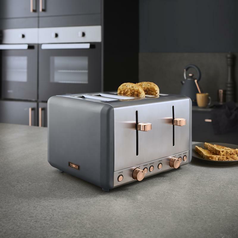 Combining grey and rose gold with a durable stainless steel finish, this Cavaletto 4 slice toaster injects a splash of contemporary design into your breakfast routine. The variable browning controls let you select the perfect toasting texture to suit your taste. Defrost, reheat and cancel options put you in control of the toasting cycle, so you can warm up your snacks or toast straight from frozen. The removable crumb tray captures any excess crumbs to make for easy disposal and to maintain the toaster's quality performance. The integrated cord storage keeps your counter surfaces free from trailing wires.