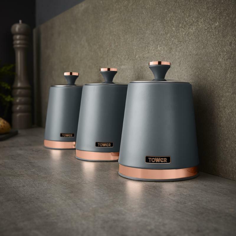 Wrapped in a staple design feature for today's modern home, the durable carbon build of these canisters locks in the freshness of your chosen ingredients, while presenting a reliable and highly styled storage compartment for your teas, coffees and sugars. The carbon structure is finished with a coating of matte grey, with rose gold tones for a tasteful finishing touch to compliment your kitchen environment. The removable lids provide maximum access to the inner capacity for easily retrieving of the contents stored inside. Each canister requires only a simple wipe clean to make for easy maintenance of its on-trend finish.