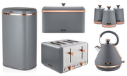 Brand New with 1.7L 3KW Pyramid Kettle, 4 Slice 1800W Toaster, Bread Bin, Set of 3 Tea, Coffee & Sugar Canisters & 58L Sensor Bin in Grey & Rose Gold