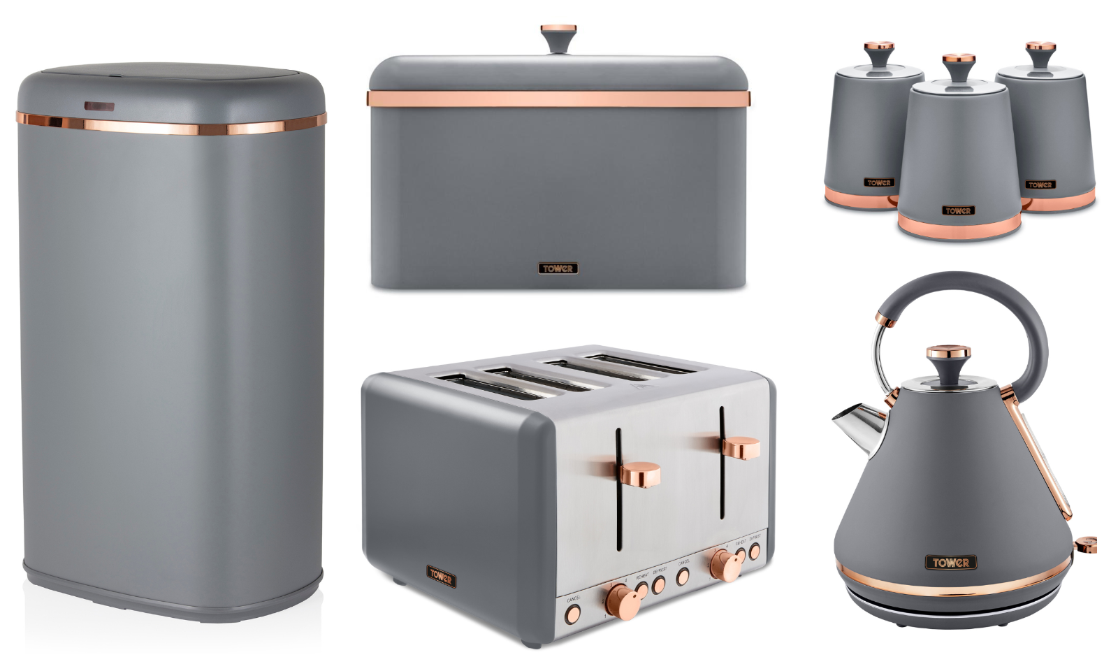 Contemporary Matching Set of 7 Kitchen Items in Grey & Rose Gold. Fast Dispatch & Free Next Day Delivery from UK Stock. Full 3 Year TOWER Manufacturer Guarantee