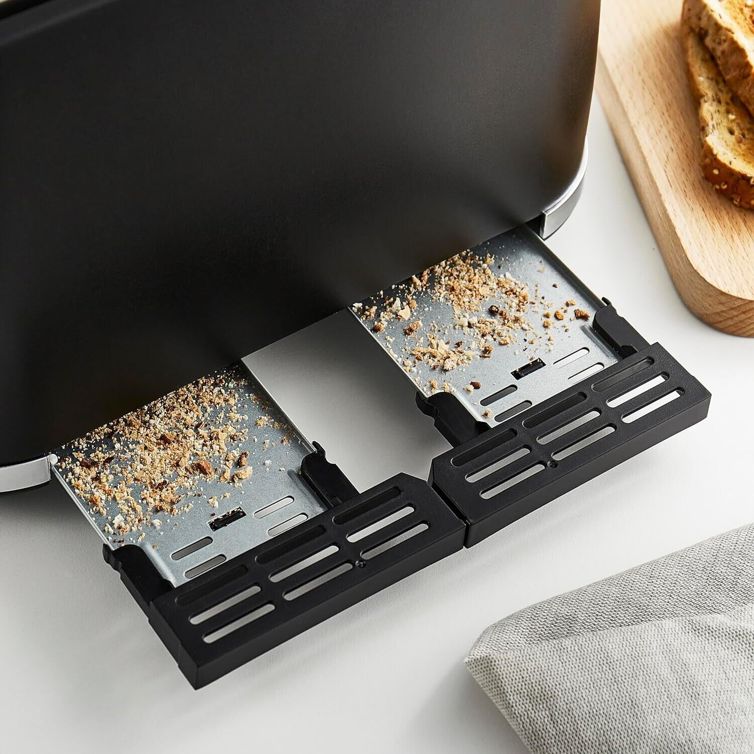 Make perfect toast every time with the Swan Serenity ST19024BLK 4-slice toaster. If you live in a busy household, toast four slices of bread, muffins, crumpets, bagels and more at one time, removing the stress of getting everyone out the door. Some baked goods need the right time toasting to get the best possible results, this black toaster features six adjustable browning levels, so your food is the perfect consistency. Has your toast gone cold? Reheat brings food back to its optimal temperature at the touch of a button without burning, so it's ready to eat again. Freezing bread is a great way to help save money and avoid food waste, but what if you want a quick snack? Press the defrost button after the toast is pushed down and your bread will be ready to eat from frozen in minutes. To keep your kitchen worktop nice and tidy, the removable crumb tray lets you easily dispose of crumbs and integrated storage. Our new Serenity collection encompasses our signature Swan design with contemporary matt finish.