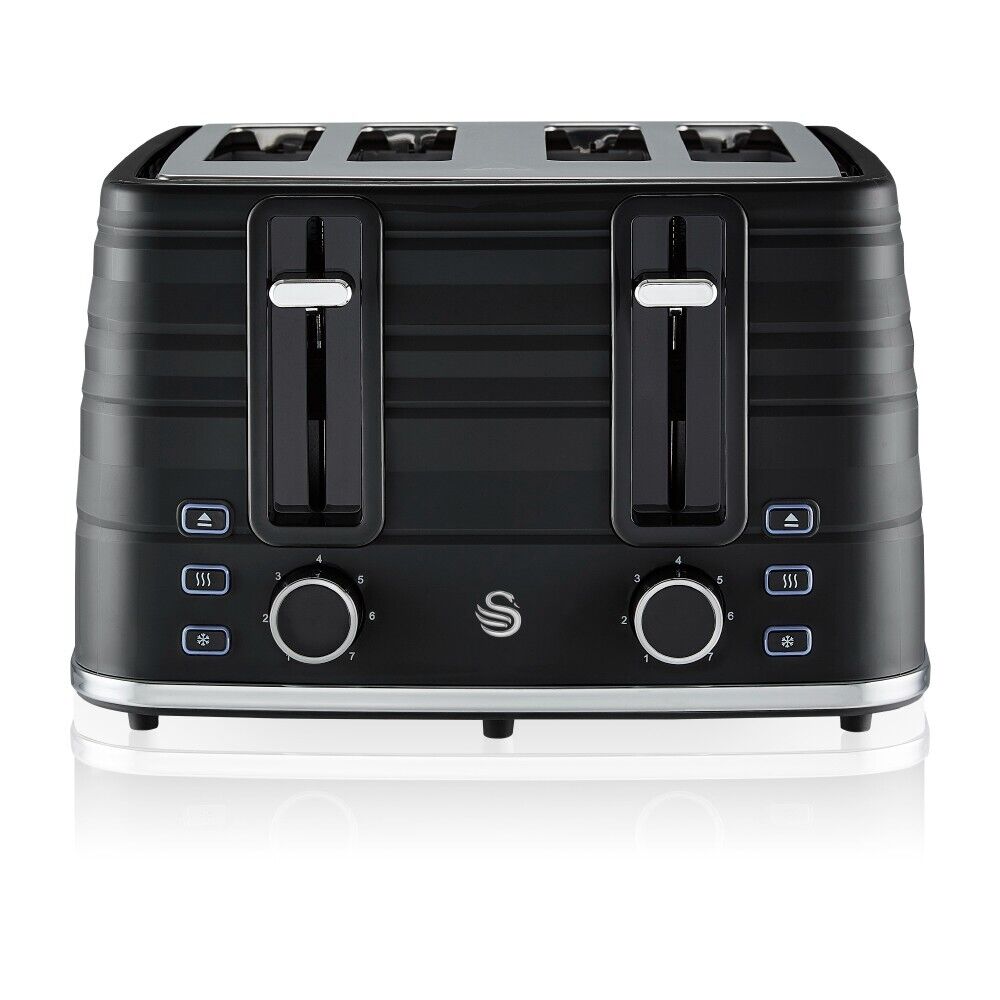 Prepare a tasty breakfast for you and the family with this stylish Swan 4-Slice Symphony Toaster. The Swan Symphony 4-slice toaster adds a touch of elegance to your kitchen. Toast up to 4 slices at once, and with independent controls for each side, you can enjoy 2 or 4 slice control. Handy functionality allows you to toast straight from frozen, or reheat toast without it toasting further making cold toast a thing of the past. Electronic browning controls ensure you can toast your bread to perfection every time, no matter your preference. The high lift function makes it easier and safer to remove your food from the toaster for added convenience. A removable crumb tray and cord storage are included to keep your kitchen clean and tidy. Featuring an elegant sweeping ribbon motif with a high gloss and matte finish and chrome detailing, the Swan Symphony 4 slice toaster is an elegant and timeless addition to your kitchen .