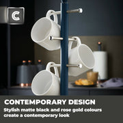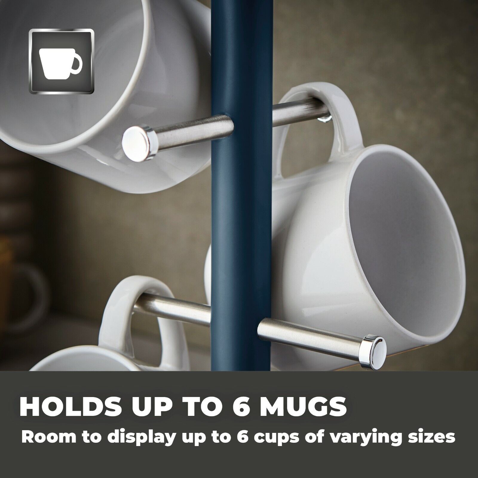 Show off your most prized mug collection with this 6 cup mug tree. Featuring our signature matte midnight blue  Cavaletto design complimented by notes of rose gold, the stainless steel design provides a durable accessory for safely storing your cups. This mug tree can comfortably hold 6 mugs of various sizes, with handy stainless steel stoppers on each of the branches to ensure the cups remain in place. The solid base enhances stability across your work surfaces, complete with a soft underliner to prevent against scratching. Easily maintain the Cavaletto design by performing a simple wipe to clean.
