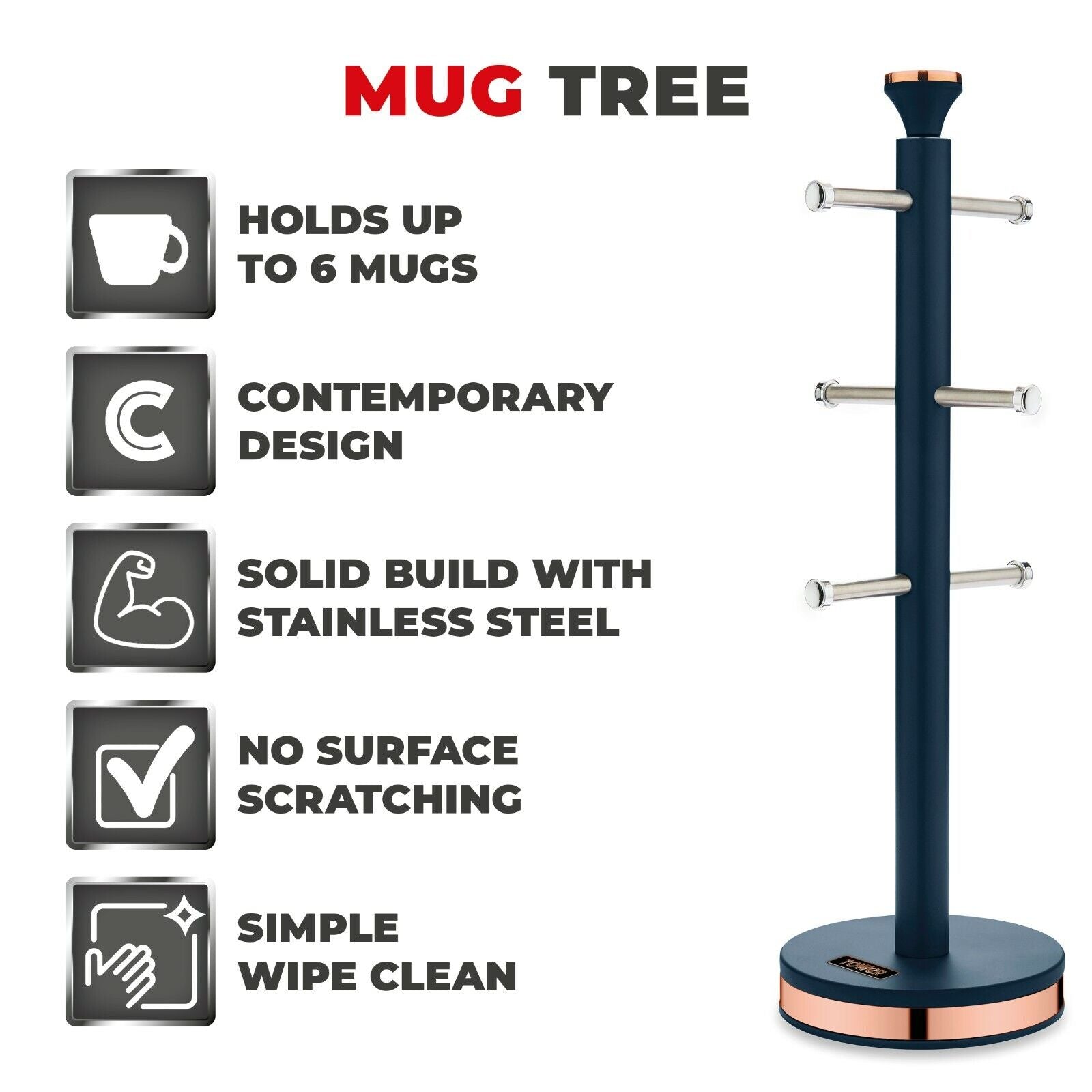 Brand New Tower Cavaletto Mug Tree & Towel Pole Matching Set in Midnight Blue & Rose Gold. Fast Dispatch & Free Next Working Day Delivery from UK Stock. Full 2 Year Manufacturer Guarantee