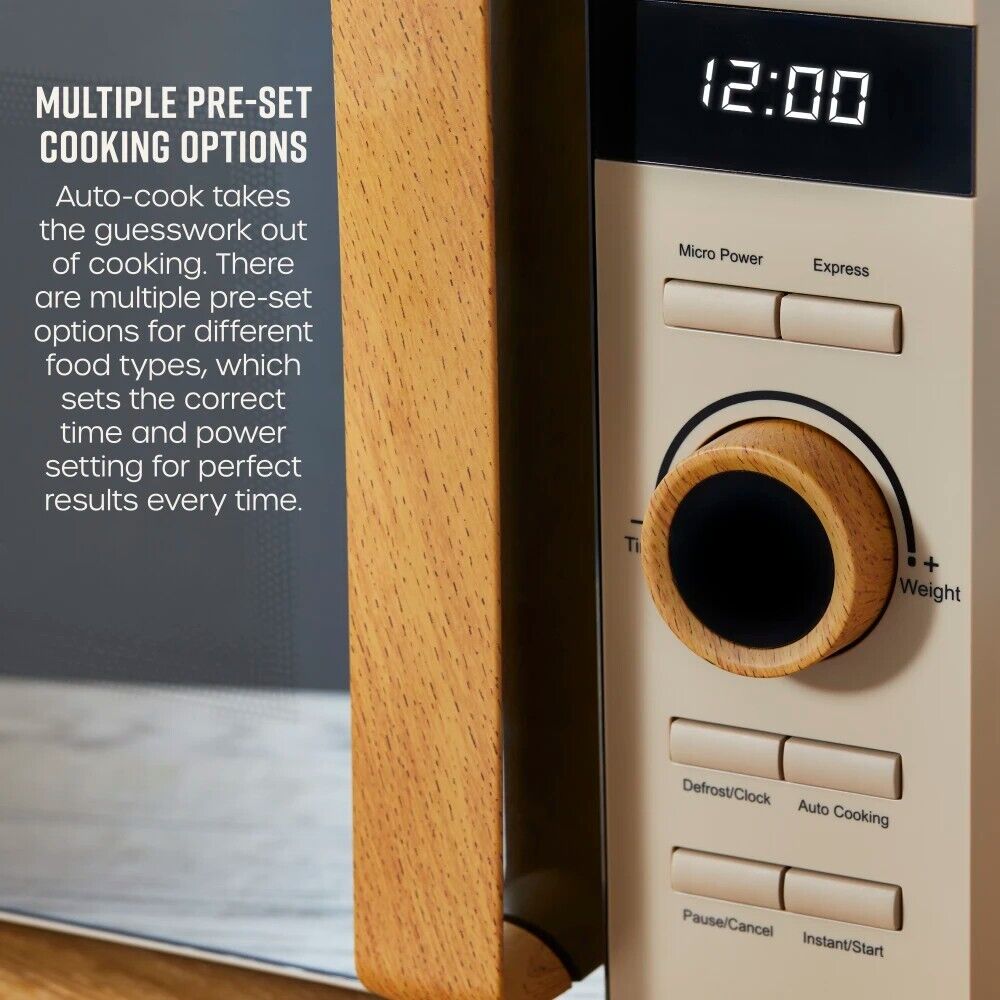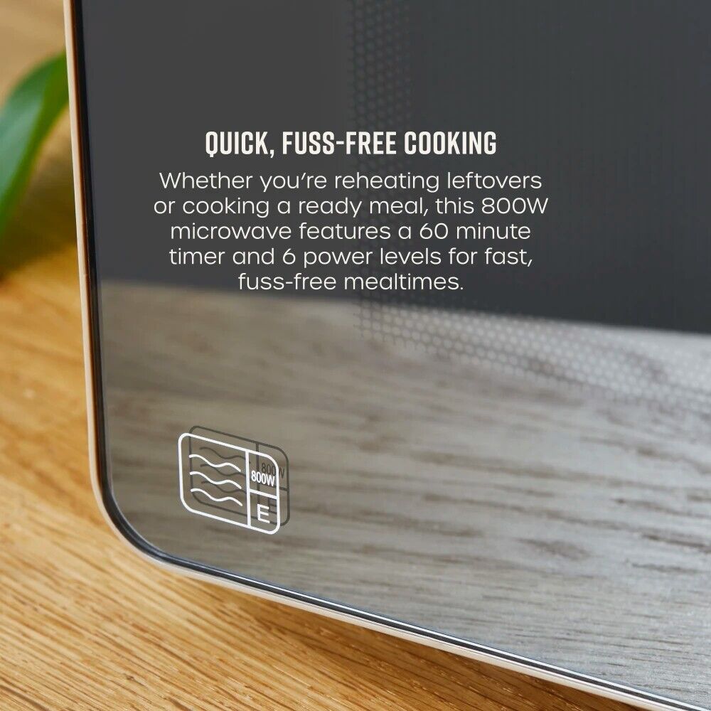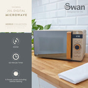Cook meals in a fast and convenient way with this Swan Nordic SM22036LOAT oatmeal digital microwave. Packed with six different power levels and 60-minute digital timer, you can reheat leftovers or cook up a ready meal with precision in no time. This 800W microwave also features an auto-cook function with pre-set options that sets the appropriate time and power level for different foods, taking the guesswork out of cooking. If you are pressed for time and need a quick meal from the freezer, then the handy defrost option will allow you to cook straight from frozen for added convenience. This Swan microwave has a large 20 litre capacity with a 270mm high quality glass turntable, which provides complete coverage of your food to ensure its cooked thoroughly. It also features an LED display that shows the clock and remaining cooking time. The Swan Nordic collection is inspired by Scandinavian minimalist design, featuring neutral colour schemes and wood-effect accents to compliment any home decor.
