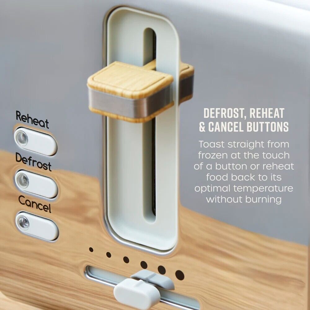 Start your morning off right with a delicious breakfast using the Swan Nordic ST14610OAT oatmeal 2-slice toaster. Whether it's toast, muffins, crumpets or bagels, get perfect results customised to your liking thanks to the six adjustable browning levels. Toast gone cold? Simply press the reheat button and your food will be back to its optimal temperature without burning, ready to start eating again. Freezing bread is a great money saver and food waste solution, but what if you fancy a quick night-time snack? Just press the defrost button after the toast is pushed down and your bread will be ready to eat from frozen within minutes. To keep your kitchen worktop nice and tidy, this oatmeal toaster features a removable crumb tray to easily dispose of crumbs and integrated cord storage. Includes non-slip rubber feet for added stability. The Swan Nordic collection is inspired by Scandinavian minimalist design, featuring neutral colour schemes and wood-effect accents to compliment any home decoaccents to compliment any home decor.