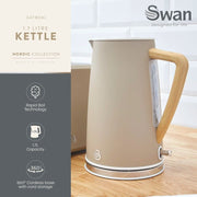 Wake up or wind down with a nice brew using the Swan SK14610OAT Nordic oatmeal cordless electric kettle. Featuring a large 1.7 litre capacity, make up to 8 cups on a single boil, perfect for entertaining friends and family. Need a quick drink before heading out the door? The 3KW fast boil technology boils one cup in under 45 seconds - make the perfect drink in minutes. This kettle has a pull up lid for easy refilling, with a 360-degree base and soft touch handle so left or right handed users can comfortably pour drinks. Boil dry protection prevents over boiling if there isn't enough water to avoid long-term damage. After boiling, the kettle switches off automatically for extra safety, while the on/off switch includes a light that illuminates when in use. Includes a limescale filter to keep your water tasting fresh, which can be removed to clean. The Swan Nordic collection is inspired by Scandinavian minimalist design, featuring neutral colour schemes and wood-effect accents to compliment any home décor