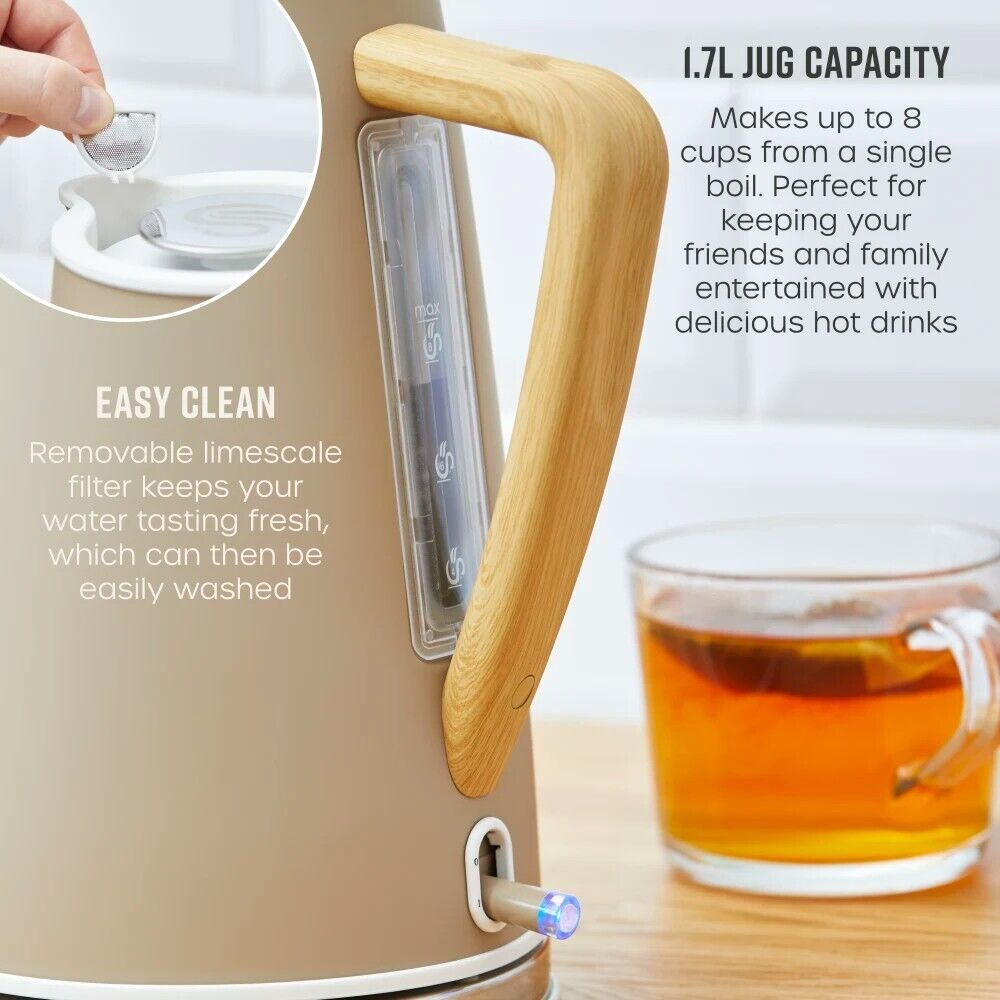 Wake up or wind down with a nice brew using the Swan SK14610OAT Nordic oatmeal cordless electric kettle. Featuring a large 1.7 litre capacity, make up to 8 cups on a single boil, perfect for entertaining friends and family. Need a quick drink before heading out the door? The 3KW fast boil technology boils one cup in under 45 seconds - make the perfect drink in minutes. This kettle has a pull up lid for easy refilling, with a 360-degree base and soft touch handle so left or right handed users can comfortably pour drinks. Boil dry protection prevents over boiling if there isn't enough water to avoid long-term damage. After boiling, the kettle switches off automatically for extra safety, while the on/off switch includes a light that illuminates when in use. Includes a limescale filter to keep your water tasting fresh, which can be removed to clean. The Swan Nordic collection is inspired by Scandinavian minimalist design, featuring neutral colour schemes and wood-effect accents to compliment any home décor