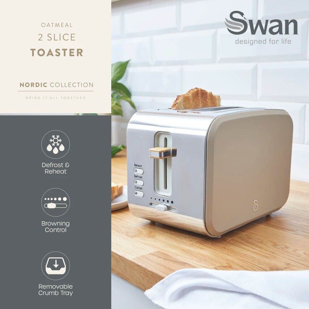 Swan Nordic 1.7L 3KW Kettle, 2 Slice Toaster & 3.5L Slow Cooker in Oatmeal Colour. Scandinavian Minimalist Design Matching Kitchen Set