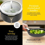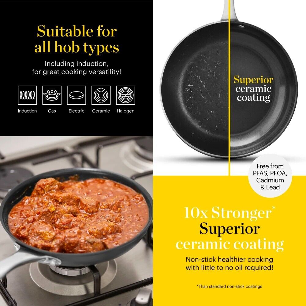 Get the most out of your kitchen and make mealtime memories with your family using this essential 5-piece cookware set from Good Food in partnership with Tower. The set consists of 16cm/18cm/20cm saucepans and 20cm/28cm frying pans, all specially designed to be used with our vast Good Food online recipe library. These pans have been expertly crafted from 3.5mm forged hard anodised aluminium, so are durable and long-lasting. The full induction bases provide rapid heat up and even distribution with no heat spots. The riveted steel handles offer ultimate comfort and easy manoeuvrability. All the pans are oven safe up to 220C, with bonded bases for use on any hob type, including induction. The saucepan lids have pouring lips for easy serving and dual sized straining holes. The 5 piece pan set is dishwasher safe for fuss-free cleaning, although we recommend a handwash to maintain the high quality finish. The saucepans and frying pans are also free from PFAS, PFOA, PTFE, lead and cadmium