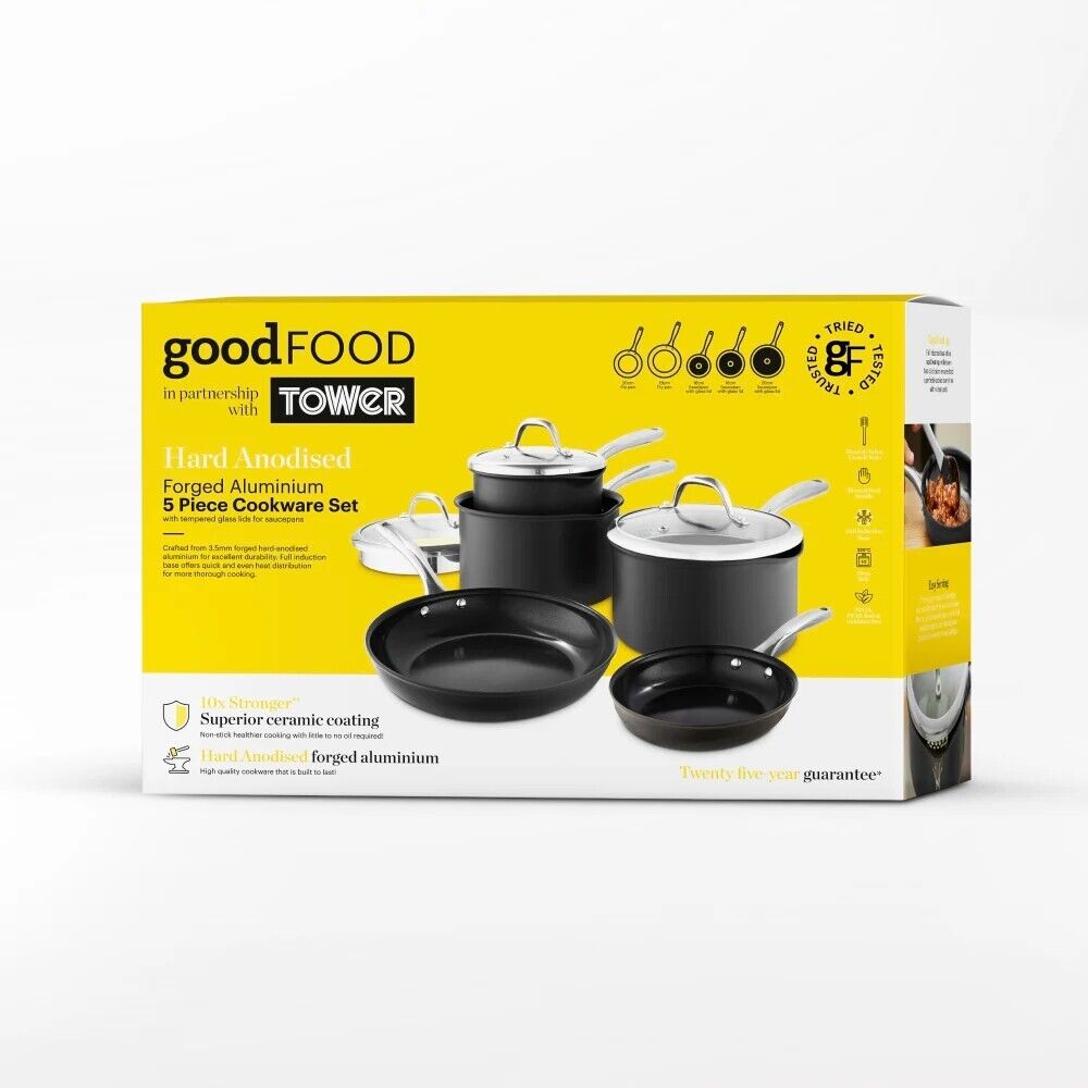 Good Food by TOWER Hard Anodized 5 Piece Cookware Set. Fast Dispatch & Free Next Working Day Delivery. 25 Year Manufacturer Warranty