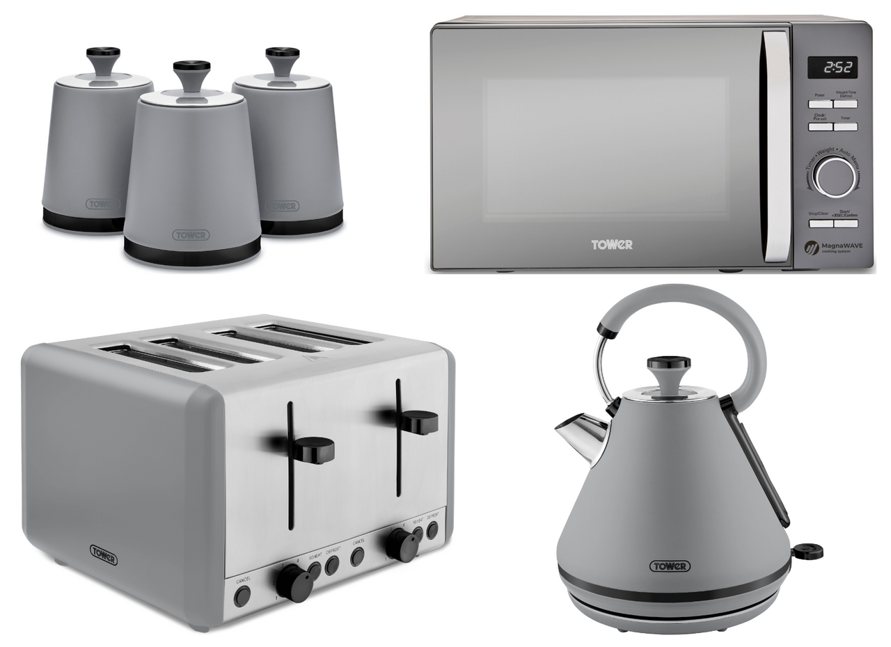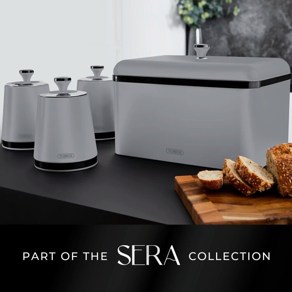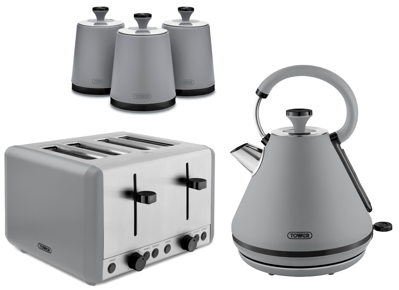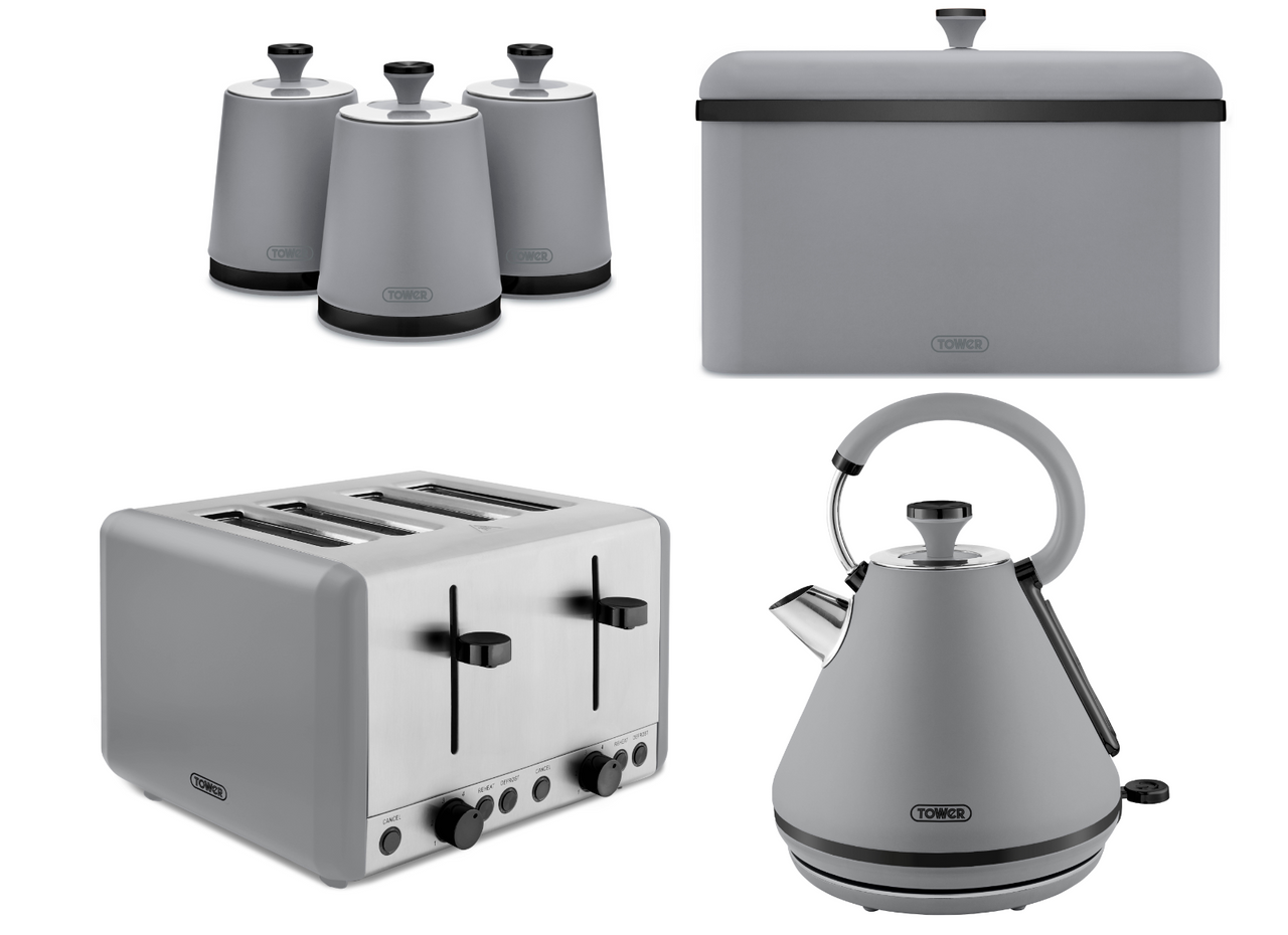 Introducing the all-new Tower Sera Range of Kettles, Toasters, Bread bins and Tea, Coffee, Sugar Canisters. Designed to complement modern lifestyles, these appliances combine sleek aesthetics with cutting-edge functionality. Available in matte Grey, Black, and Blue colorways with a contemporary smoked black trim. Shop the New Tower Sera Kettle & Toaster Collection at The Hale Retail Company