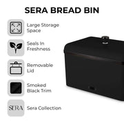 This beautiful bread bin from Sera is perfect for keeping your favourite baked good fresh for longer. The stylish matte black finish with smoked black trim adds a sleek feel to any modern kitchen and perfectly complements any contemporary and traditional decor. The lid is fully removable for easy access and completely airtight for long lasting freshness. The compact design and large inner capacity ensures it takes up minimal space on the countertop, whilst a simple wipe clean is all that is required to keep the bread bin in pristine condition.