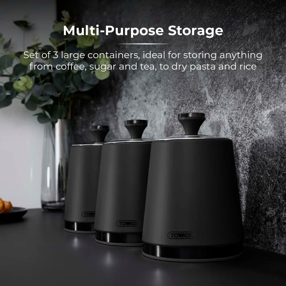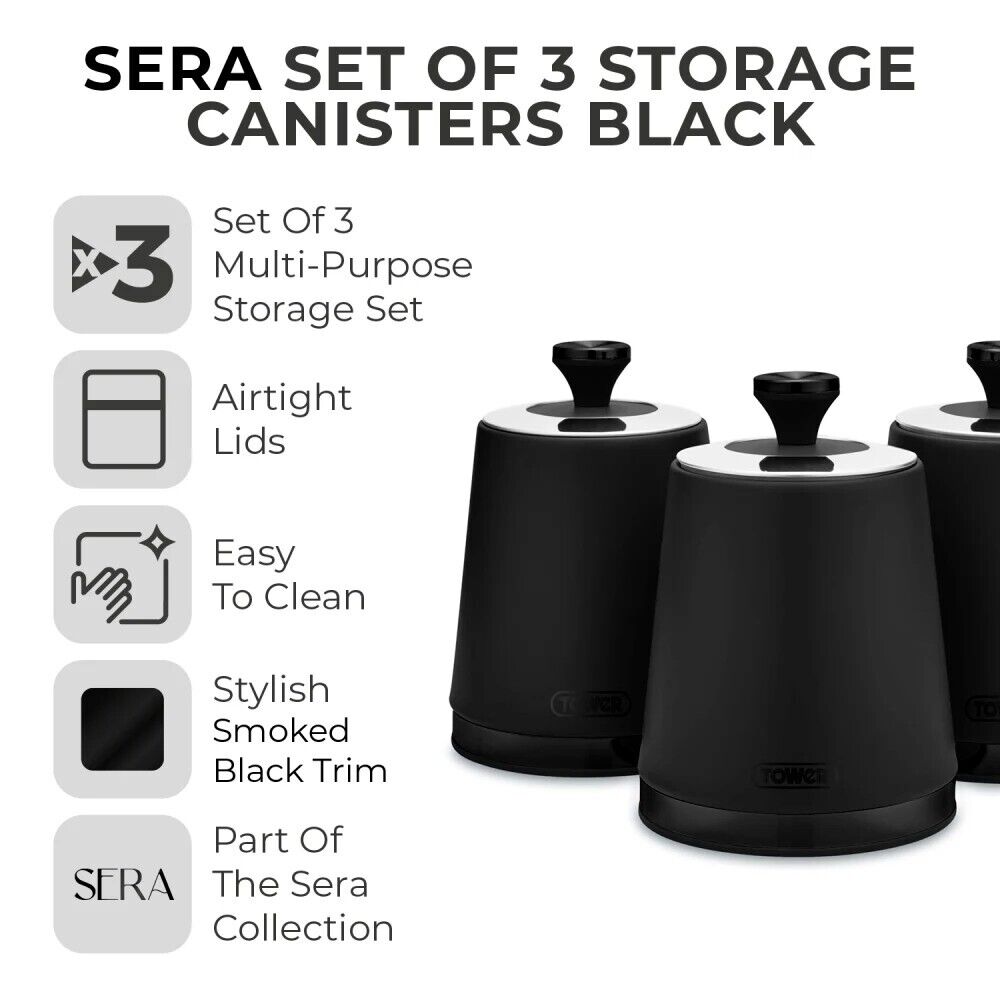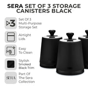 This set of three storage canisters from Sera are perfect for keeping your worktops tidy, whilst they can also be utilised to storage tea, coffee and sugar The stylish matte black finish with smoked black trim adds a sleek feel to any modern kitchen and perfectly complements any contemporary and traditional dcor. The lids are fully removable for easy access and completely airtight for long lasting freshness. The compact design and large 1.3L capacity ensures they take up minimal space on the countertop, whilst a simple wipe clean is all that is required to keep the canisters in pristine condition.