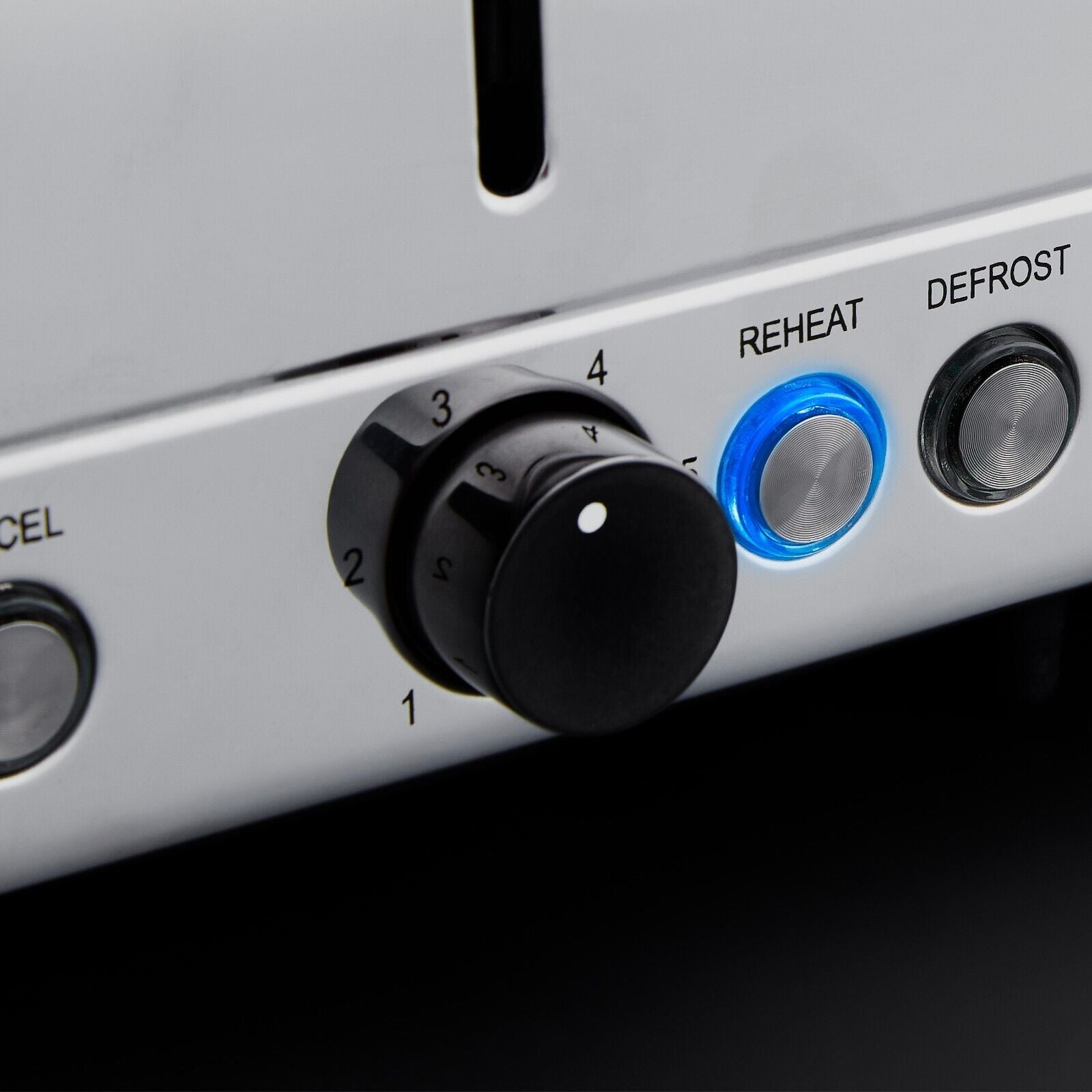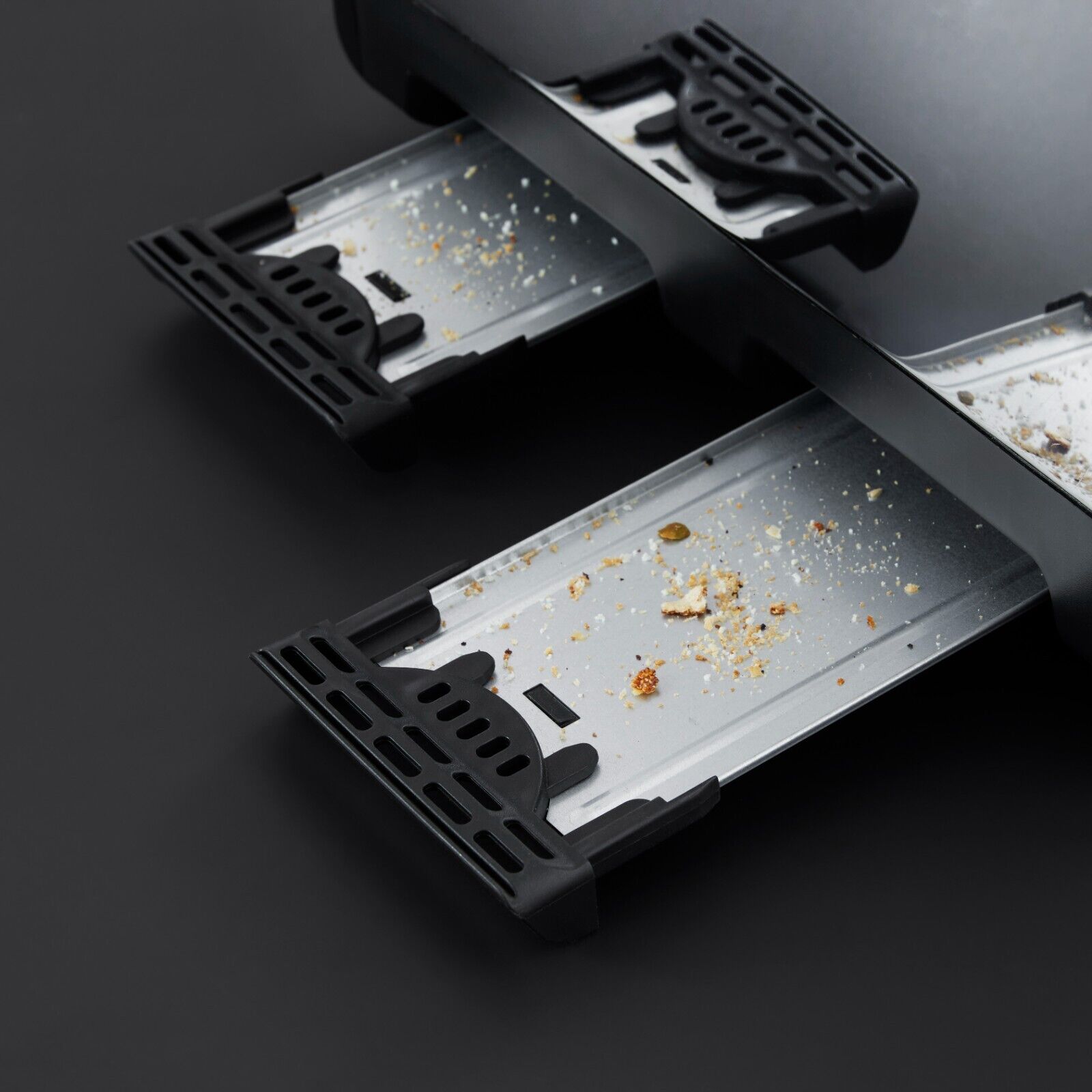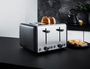 Enjoy your toast, crumpets and bagels exactly how you like them with the Tower 4-slice toaster. Featuring 6 browning settings, it gives you more control over the toasting time so you can select the right texture to suit your taste. The cancel option allows you to stop the toaster at your convenience. The removeable trays make it easy to dispose of excess crumbs to keep your countertop clean, with integrated cord storage to keep your surface neat and free from wires. Non-slip feet will keep the toaster secure on the countertop for additional safety. The self-centring function keeps the bread secure to ensure thorough and even toasting. Complete with an anti-jam function to prevent toast, bagels and other snacks from getting stuck, the toaster requires a simple wipe clean with a damp cloth to keep it in pristine condition