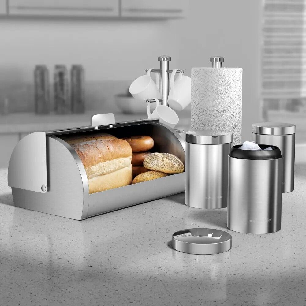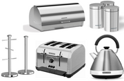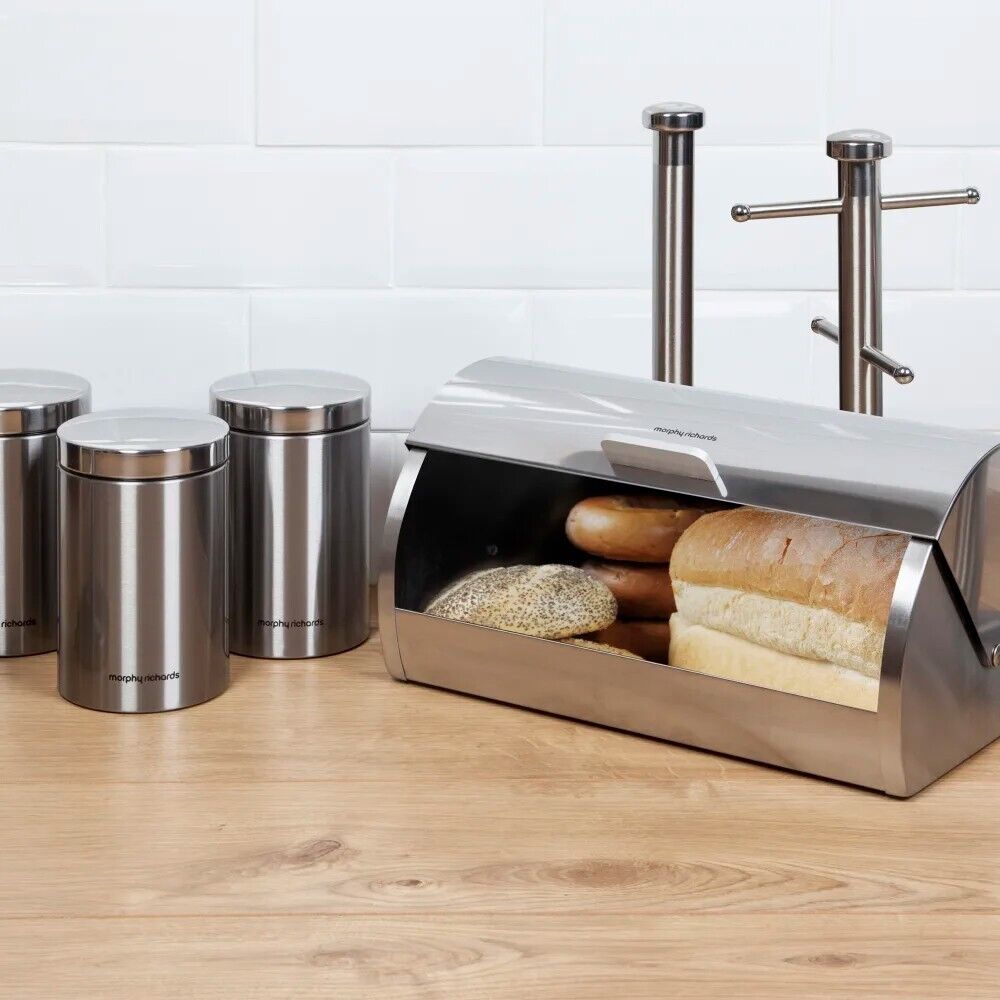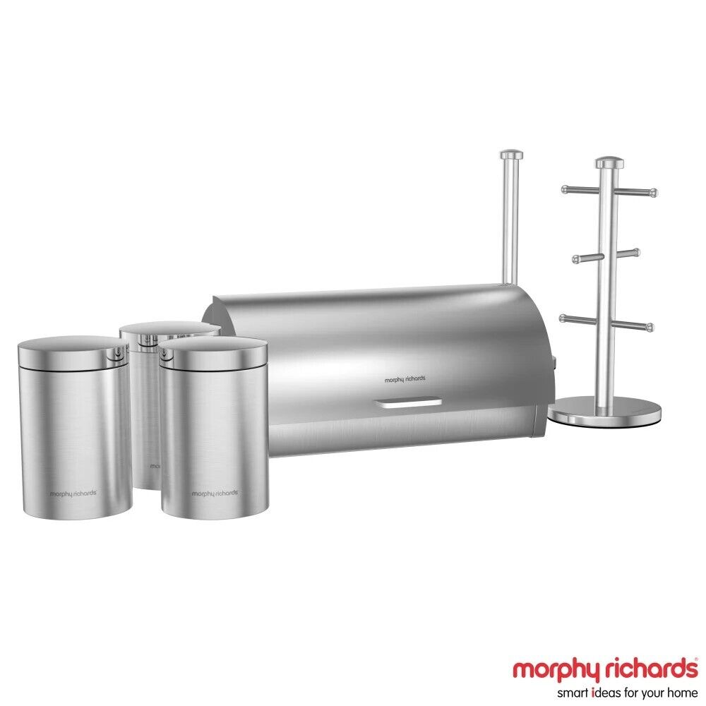 Morphy Richards Venture Brushed Steel 1.5L 3KW Pyramid Kettle, 4 Slice Toaster & Accents Bread Bin, Canisters, Mug Tree & Towel Pole Matching Kitchen Set in Stainless Steel. Brand New UK Stock, Fast Dispatch & Free Next Working Day Delivery. 2 Year Manufacturer Guarantee