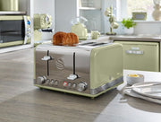 Count on the Swan Retro 4-Slice Toaster for perfectly browned bread every morning. Along with 1600 watts of power, this stylish kitchen appliance has defrost and reheat functions, plus a warming rack, giving you many options on how to prepare your favourite breads. A high-lift eject button ensures your fingers stay safe while automatic shut-off and red indicator lights help keep your toast from burning.