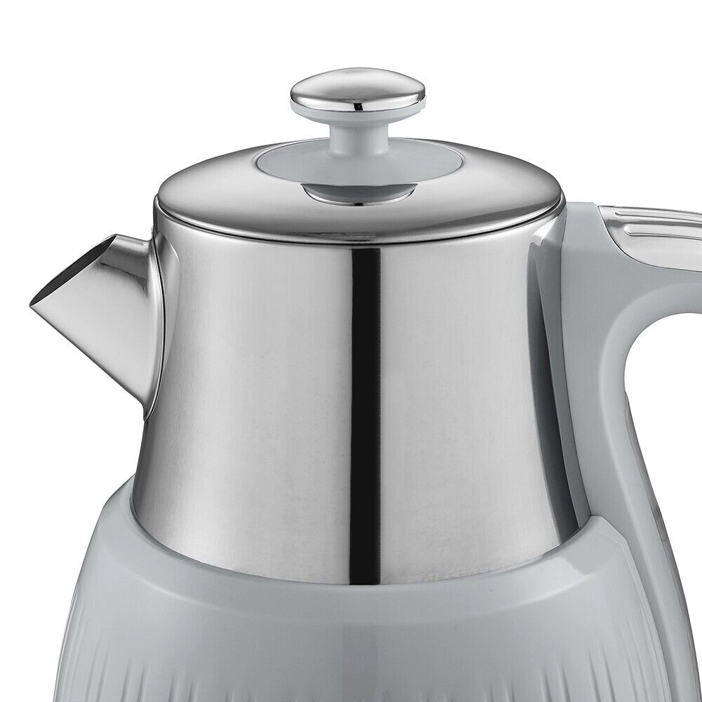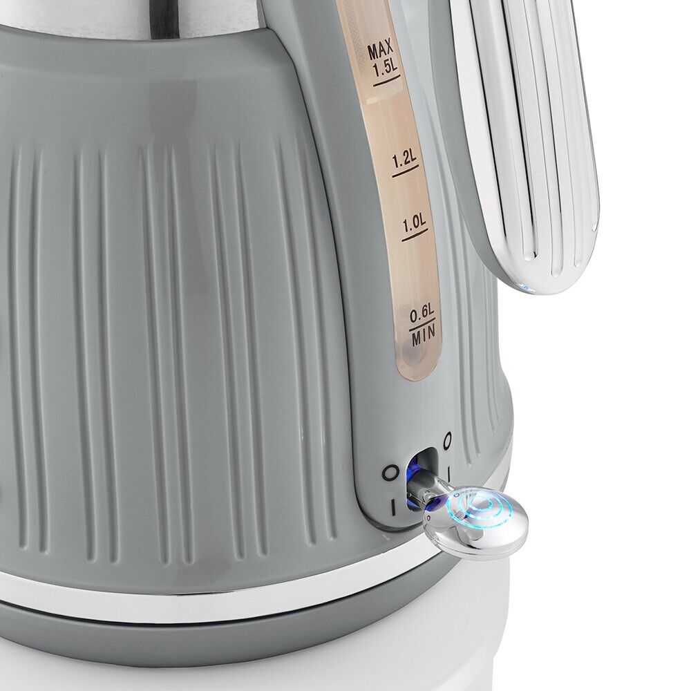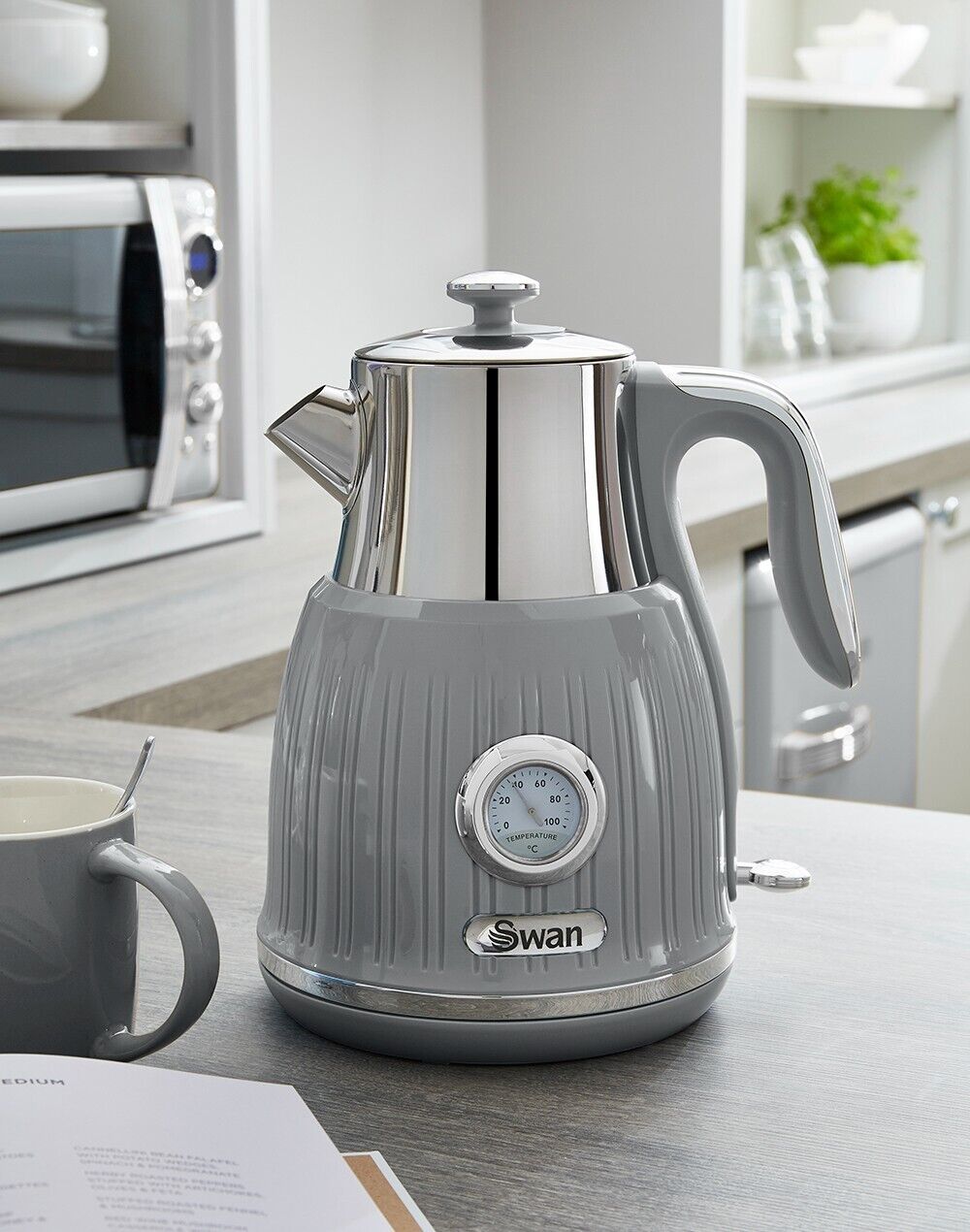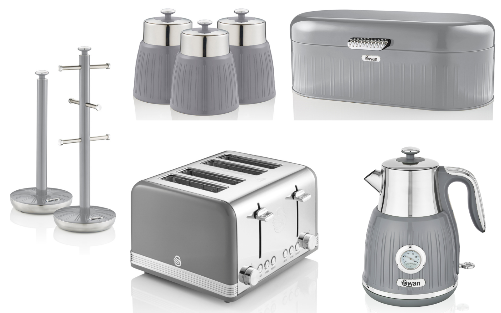 Brand New Swan Retro Kitchen Set of 8 Items in Grey including 1.5L Jug Temperature Dial Kettle, 4 Slice Toaster, Bread Bin,  Set of 3 Tea, Coffee & Sugar Canisters, Mug Tree & Towel Pole. Vintage Design Matching Kitchen Set