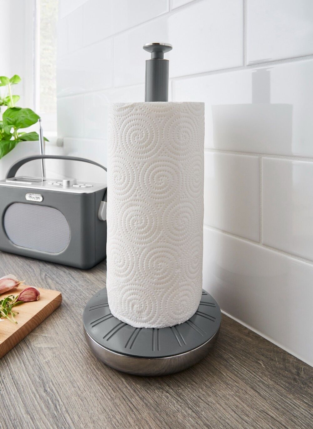 Keep your kitchen tidy and free from clutter with the help of this Swan Retro mug tree and tower pole set. A convenient and elegant way to display your favourite mugs and cups, and paper towels, the durable construction and sturdy non-slip bases ensure your mugs and paper towels are stored safely to avoid any unwanted damage.The Swan Retro mug tree keeps mugs and cups close to hand whilst keeping your kitchen countertops tidy and arranged. The mug tree can hold up to 6 mugs at a time and keeps them stored safely to prevent knocks and chips. Clean up spillages or worktop messes with ease with the stylish matching Swan Retro Towel Pole. It has enough space for any size or weight of kitchen roll and the stainless-steel base allows for convenient one-handed use, ensuring the pole doesn't slip or move about when ripping off sheets. With their simple but cool retro design with vertical stripes and chrome finishing, this set makes a stylish and useful addition to any kitchen.