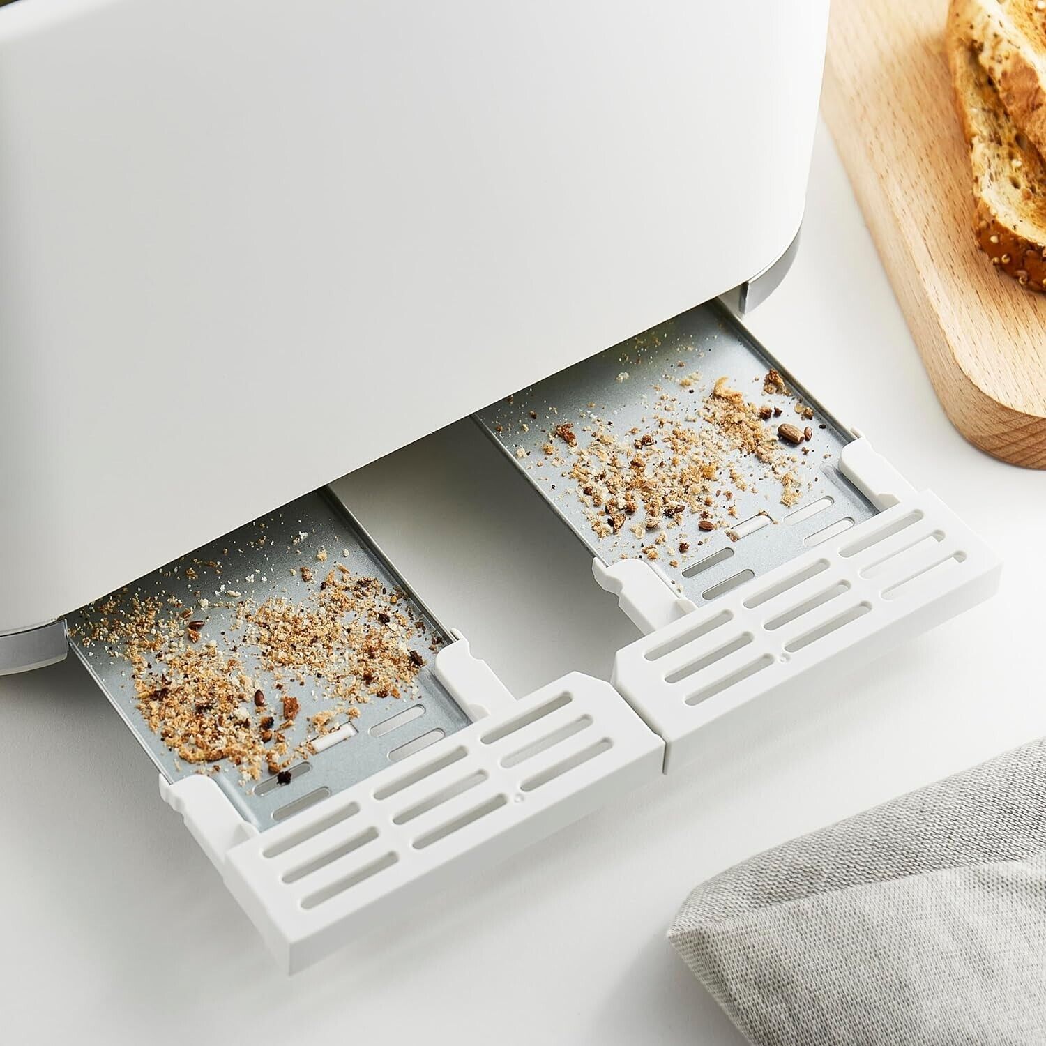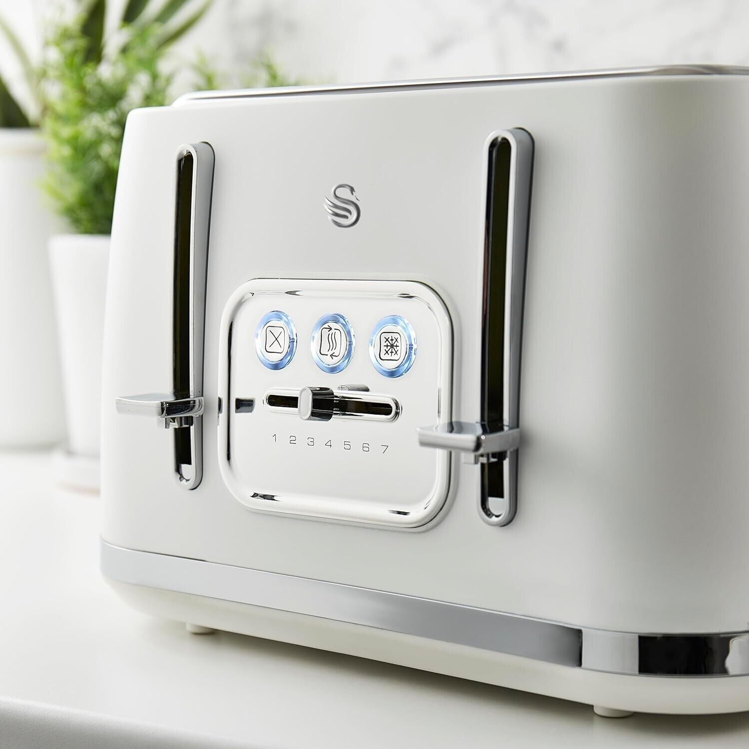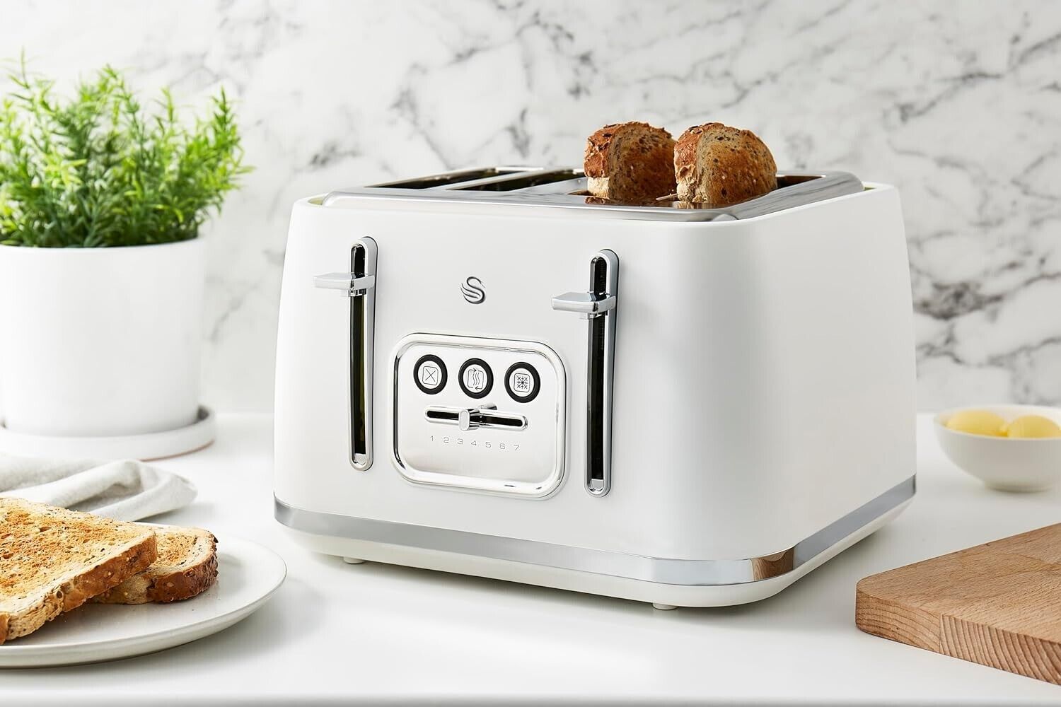 Make perfect toast every time with the Swan Serenity ST19024WHT 4-slice toaster. If you live in a busy household, toast four slices of bread, muffins, crumpets, bagels and more at one time, removing the stress of getting everyone out the door. Some baked goods need the right time toasting to get the best possible results, this black toaster features six adjustable browning levels, so your food is the perfect consistency. Has your toast gone cold? Reheat brings food back to its optimal temperature at the touch of a button without burning, so it's ready to eat again. Freezing bread is a great way to help save money and avoid food waste, but what if you want a quick snack? Press the defrost button after the toast is pushed down and your bread will be ready to eat from frozen in minutes. To keep your kitchen worktop nice and tidy, the removable crumb tray lets you easily dispose of crumbs and integrated storage. Our new Serenity collection encompasses our signature Swan design with contemporary matt finish.
