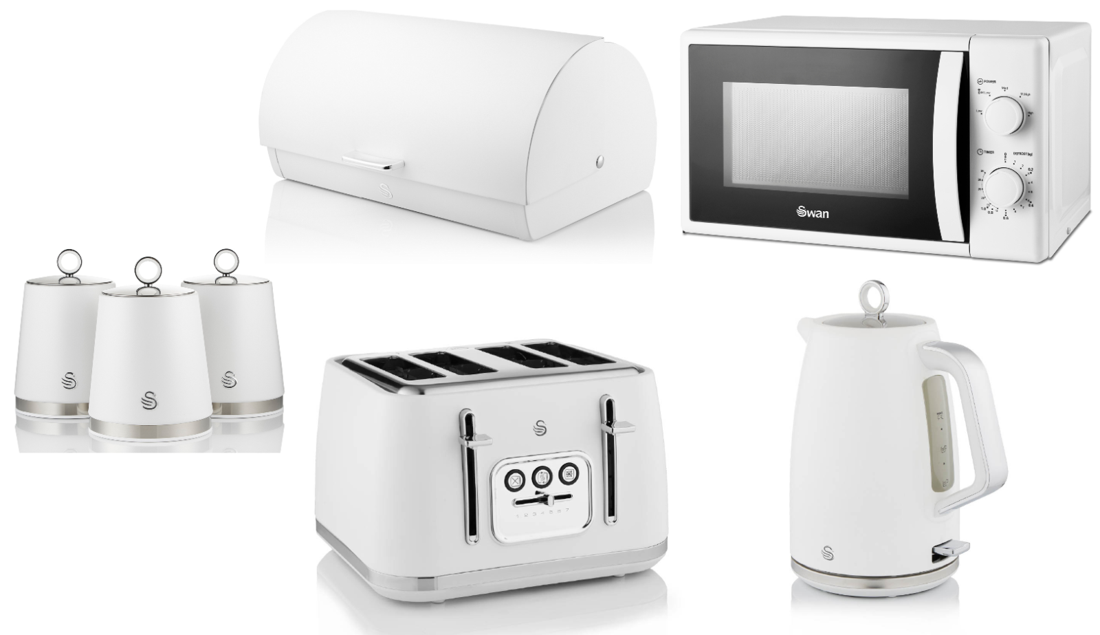 Swan Serenity White 1.7L 3KW Kettle, 4 Slice Toaster, Bread Bin, Canisters and 20L 700W Manual Microwave SM4420WHT. Beautiful Design Complete Matching Swan Kitchen Set of 7 in White