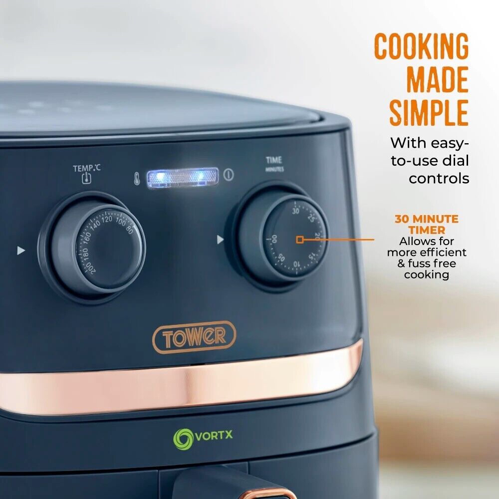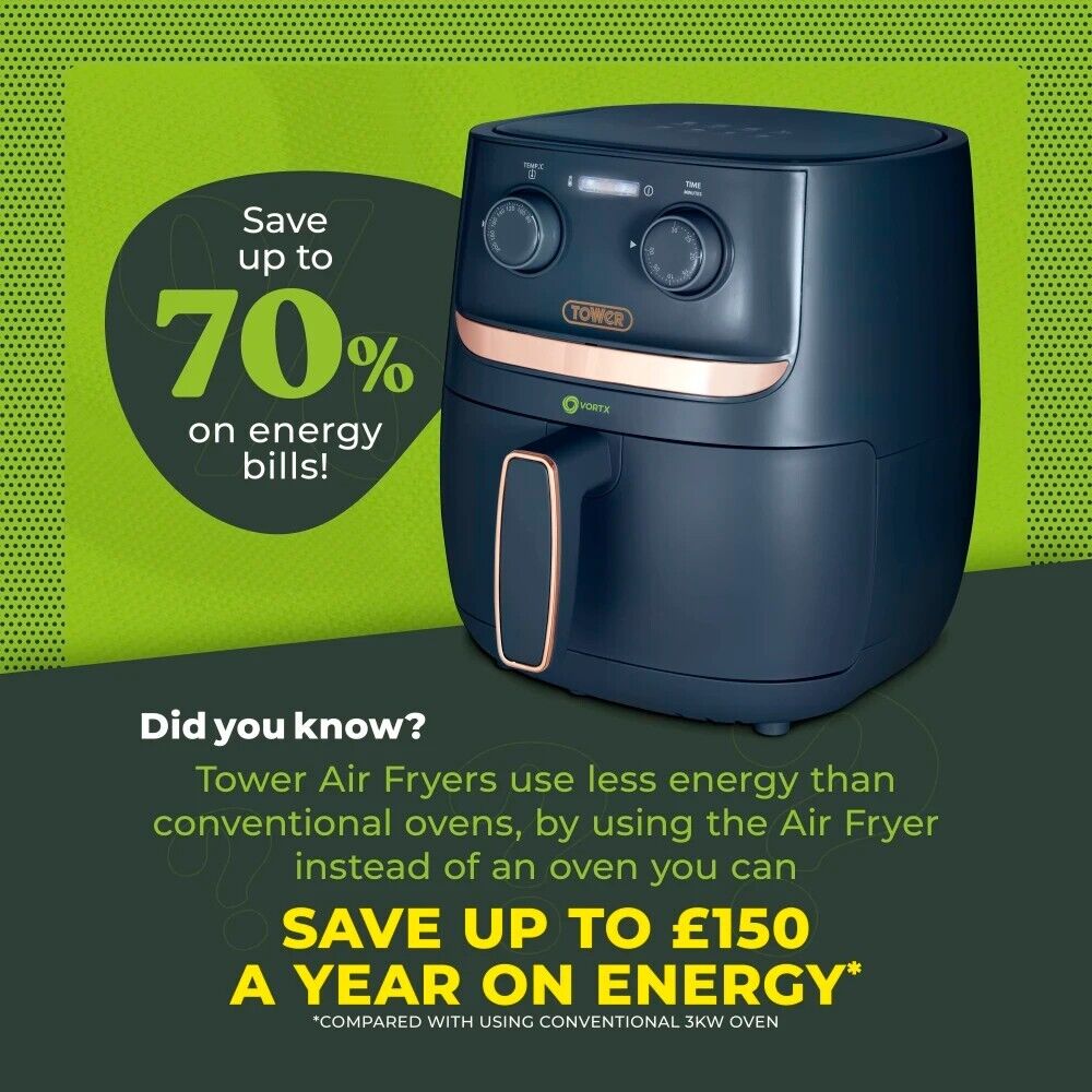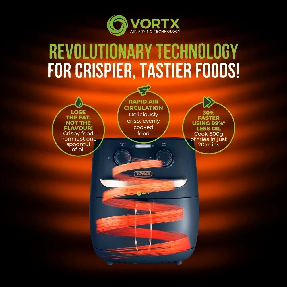 Make family cooking simple with this 3.8L Manual Air Fryer from Tower. Vortx technology rapidly circulates hot air around the chamber to cook food 30% faster with only a little oil required, perfect for healthy, yet beautifully crisp meals. Enjoy meals with 99% less fat so you get all the great taste with great health benefits. Air Fryers cook faster than a conventional oven and you could save up to 70% on your energy bills by swapping to air fryer cooking. Easy to use dials allow you to set the temperature timer, whilst the removable drawer and crisper grill tray both come with a non-stick coating for greater food release and simple cleaning. A 90cm power cord offers the freedom to move anywhere across the work top, whilst a generous 3.8L basket ensures food can be cooked for the whole family with ease. The air fryer has a smaller footprint so it doesn't take up too much space on the counter.