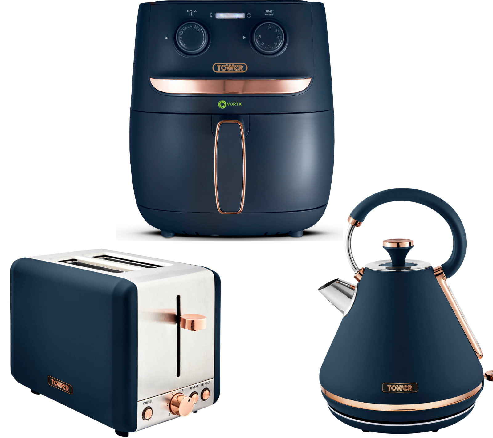 Tower Cavaletto Midnight Blue 1.7L 3KW Pyramid Kettle, 2 Slice Toaster and Vortx 3.8L Air Fryer. Contemporary Matching Kitchen Set in Matte Midnight Blue Finish with Rose Gold Accents